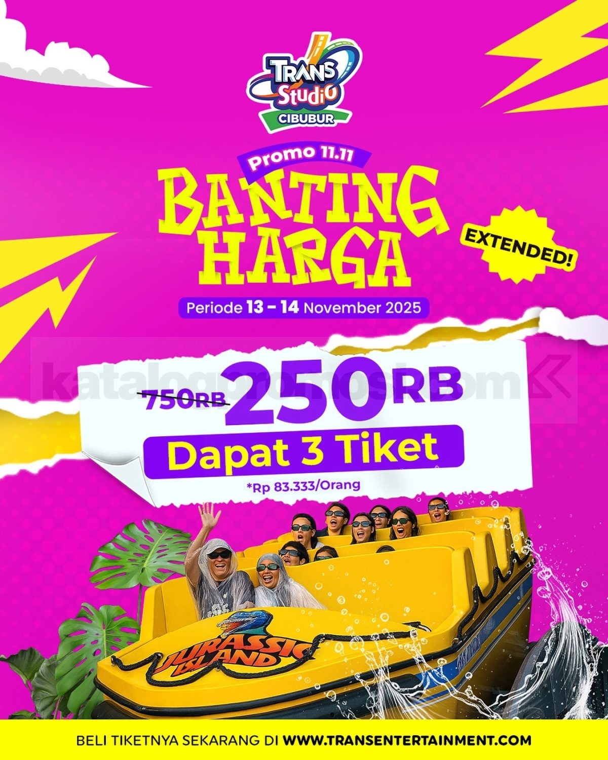 Promo Trans Studio Cibubur 11.11 Banting Harga Tiket Rp.83.333 dengan paket hemat 3 tiket Rp.250.000 berlaku 13–14 November di Trans Studio Cibubur.