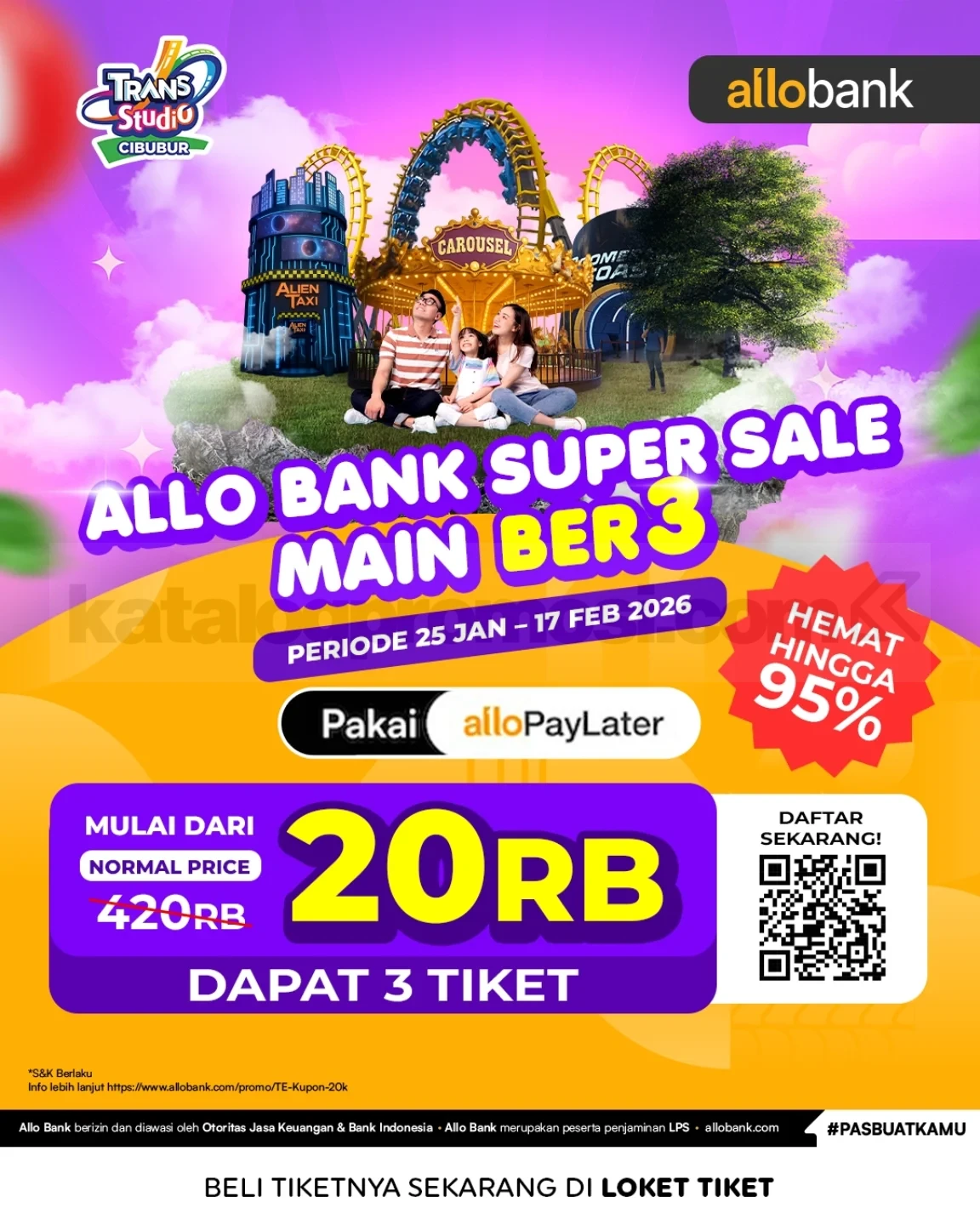 Promo Trans Studio Cibubur Allo Bank Super Sale Tiket mulai Rp. 20.000 hemat hingga 95% beli 3 tiket via AlloPayLater berlaku mulai 25 Januari 2026 – 17 Februari 2026.