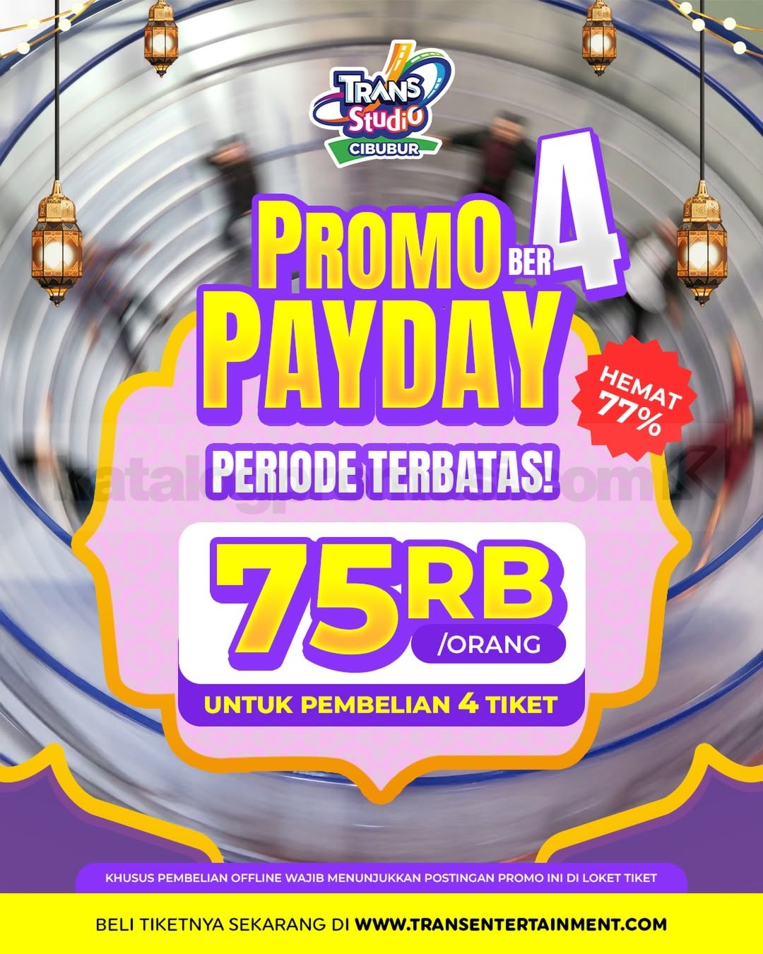 Promo Trans Studio Cibubur Ber-4 Payday Rp. 75.000 hemat hingga 77% untuk pembelian 4 tiket periode terbatas di Trans Studio Cibubur