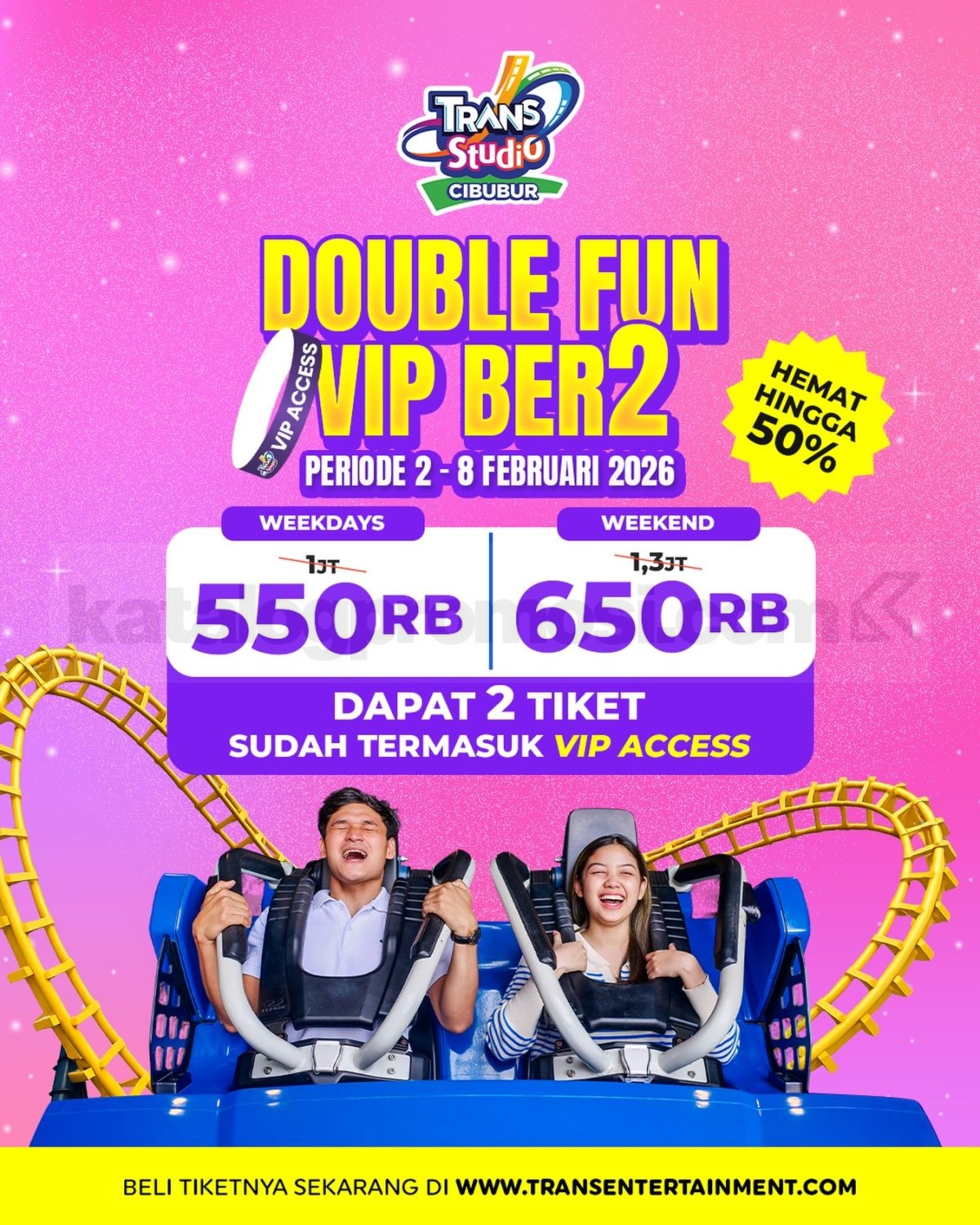 Promo Trans Studio Cibubur Double Fun VIP Ber2 Hemat Hingga 50% dengan 2 tiket dan VIP Access untuk main sepuasnya, berlaku mulai tanggal 2-8 Februari 2026.