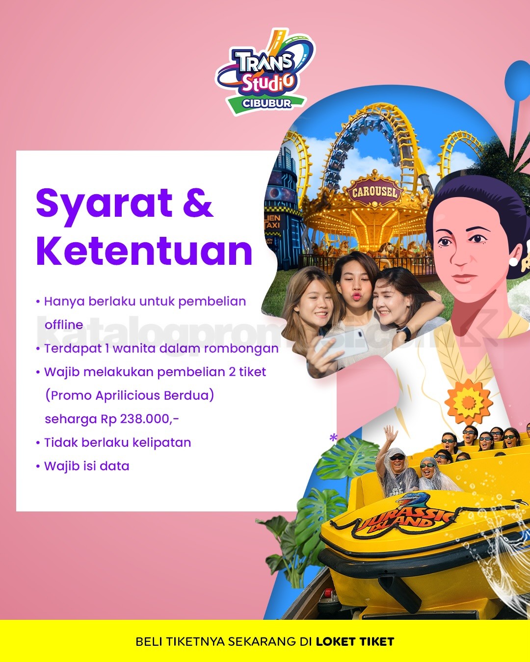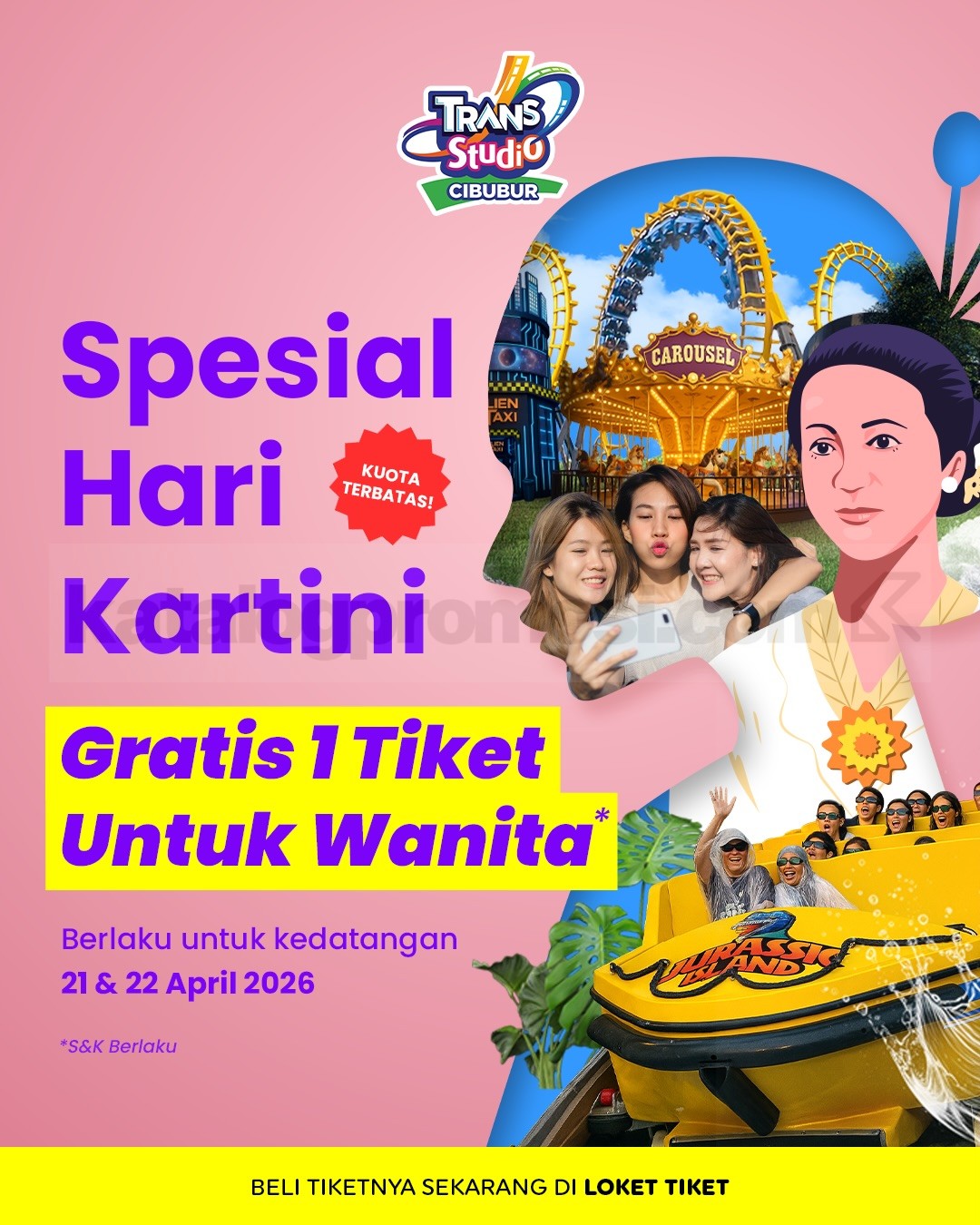 Promo Trans Studio Cibubur Hari Kartini Gratis Tiket wanita gratis 1 tiket dengan pembelian paket berlaku mulai tanggal 21 April 2026 – 22 April 2026