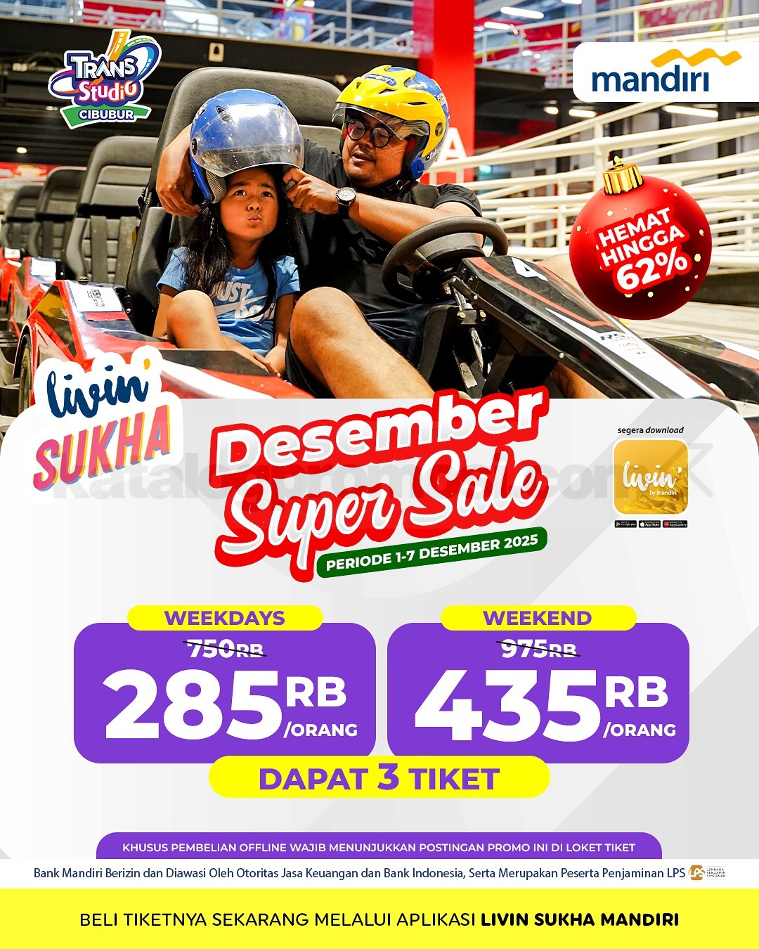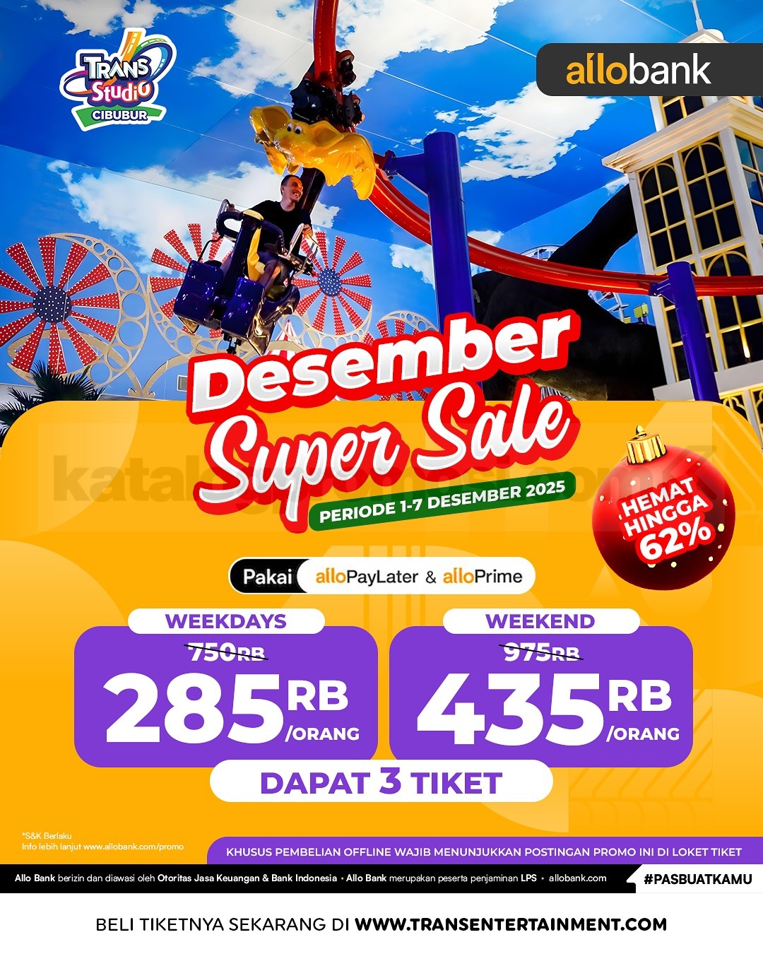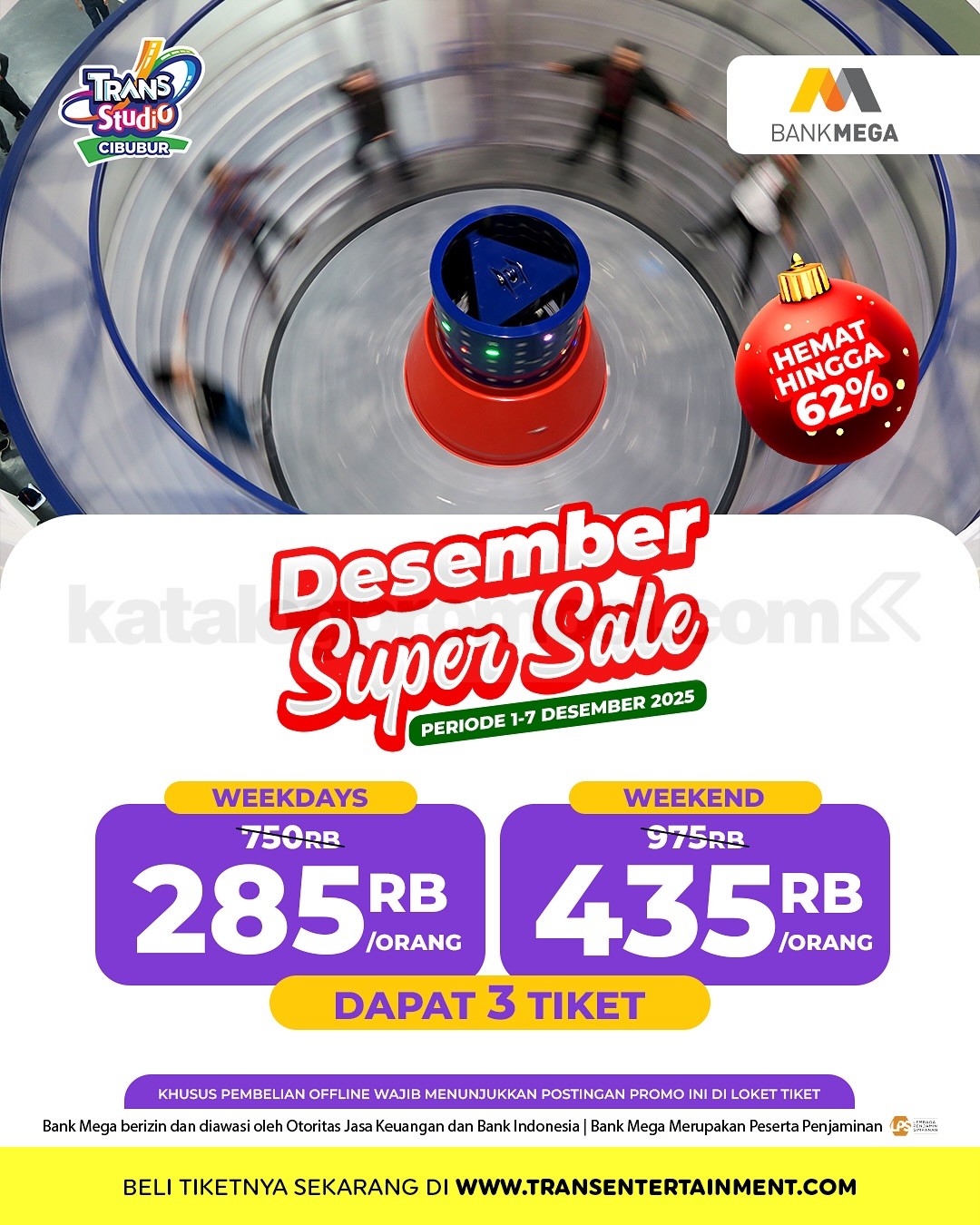 Promo Trans Studio Cibubur Hemat Hingga 62% Bank Partners, nikmati tiket spesial weekdays Rp.285.000 & weekend Rp.435.000 berlaku 1-7 Desember 2025.