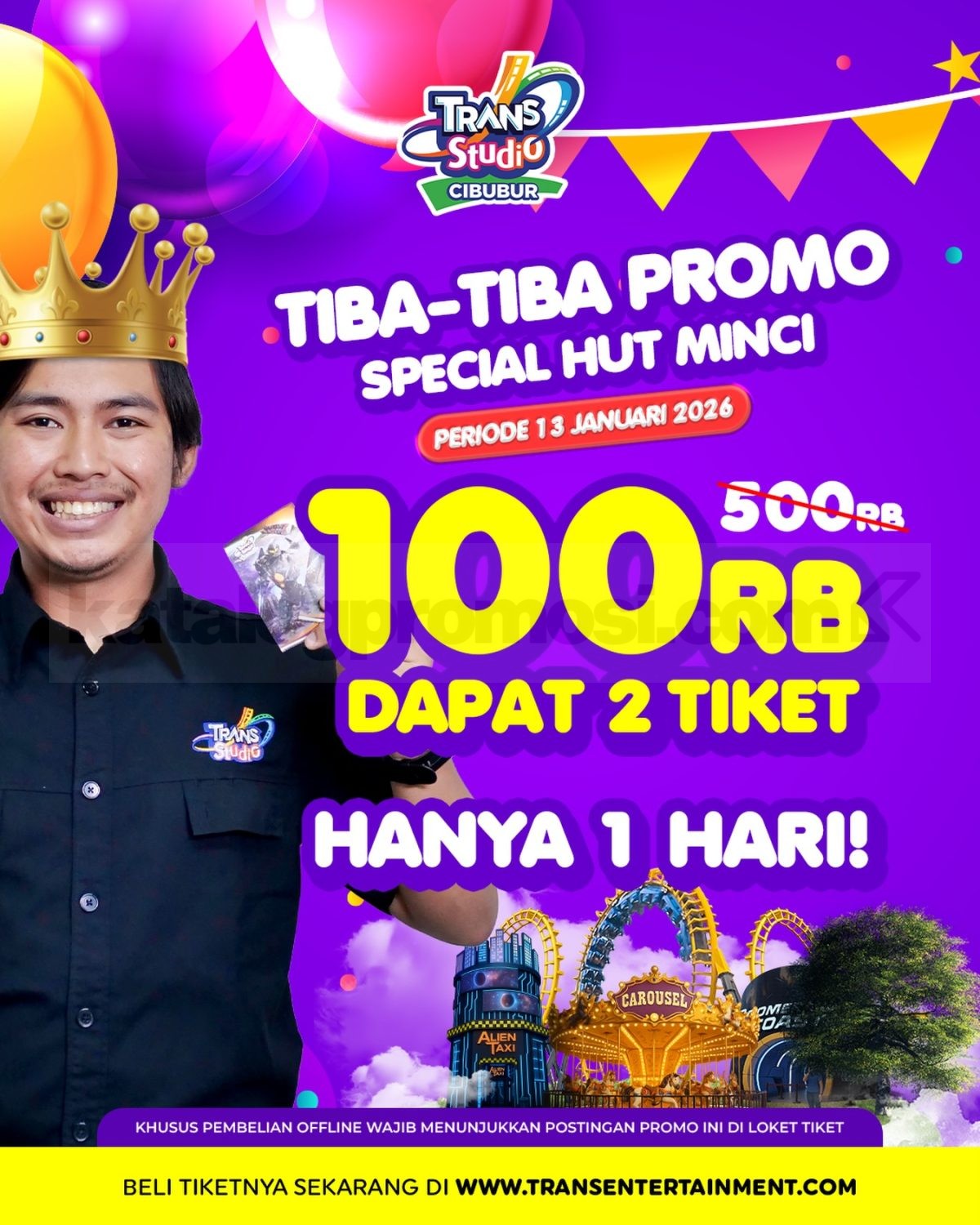 Promo Trans Studio Cibubur Spesial HUT Minci main berdua Rp. 100.000 berlaku hanya di tanggal 13 Januari 2026, beli offline atau via website resmi, tiket terbatas.