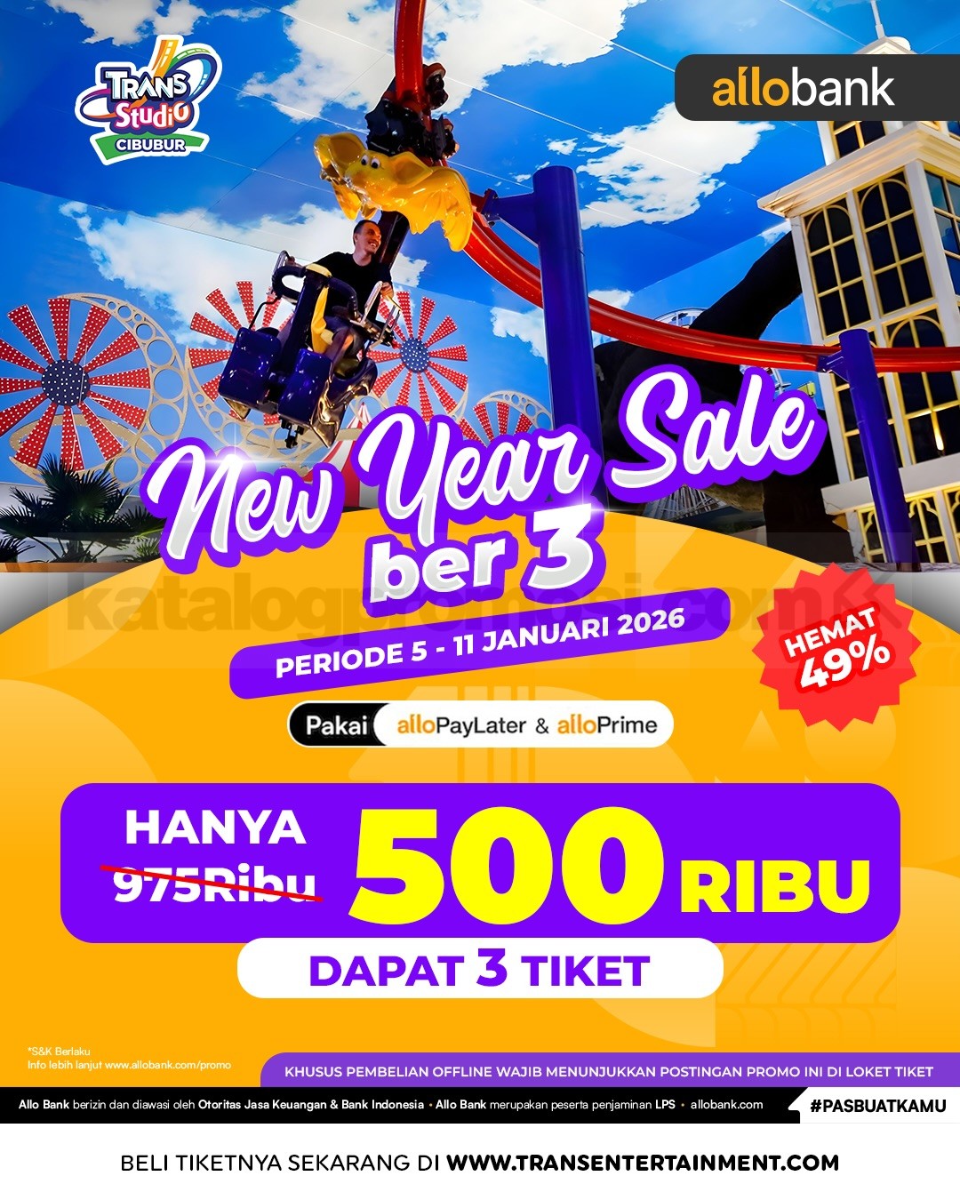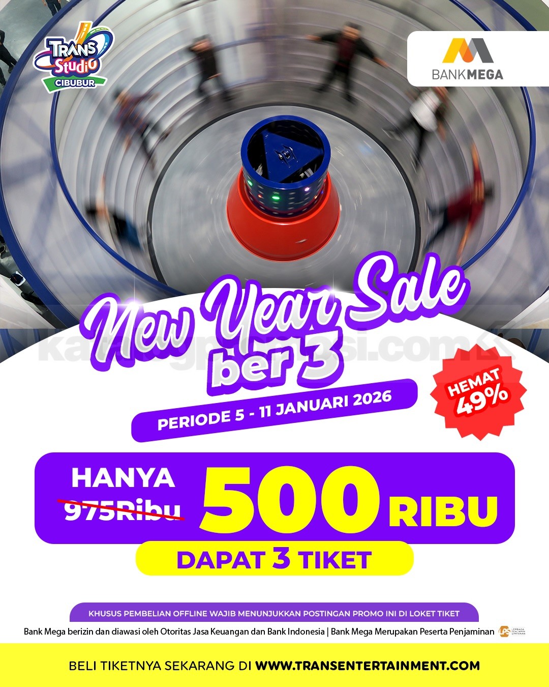 Promo Trans Studio Cibubur New Year Sale Ber3 Hemat 49% seharga Rp. 500.000 dengan pembayaran AlloBank, Bank Mega, dan Bank Mandiri berlaku mulai tanggal 5Â – 11 Januari 2026