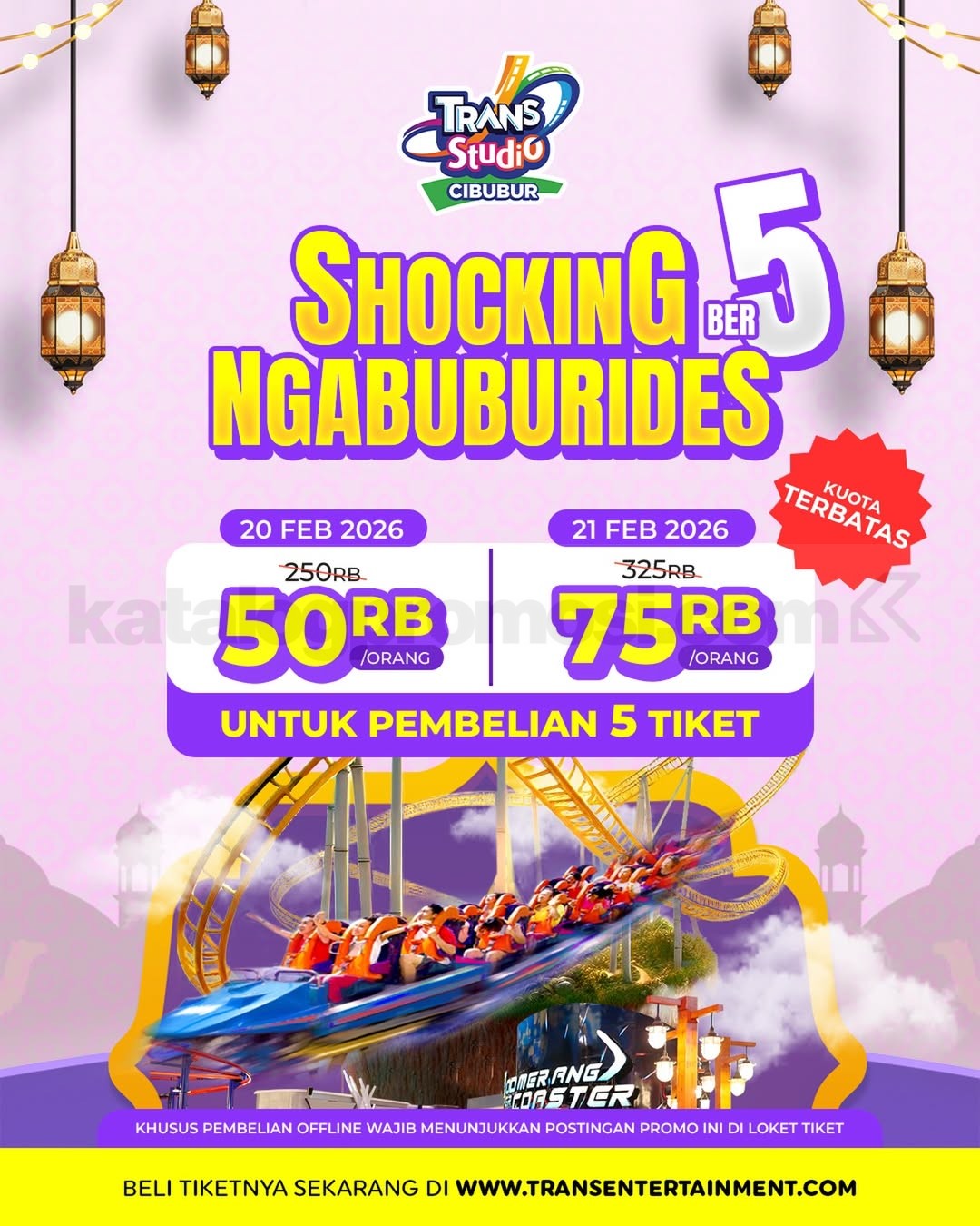 Promo Trans Studio Cibubur Shocking Ngabuburides mulai Rp. 50.000 per orang dengan pembelian 5 tiket berlaku mulai tanggal 20 Februari 2026 – 21 Februari 2026 .