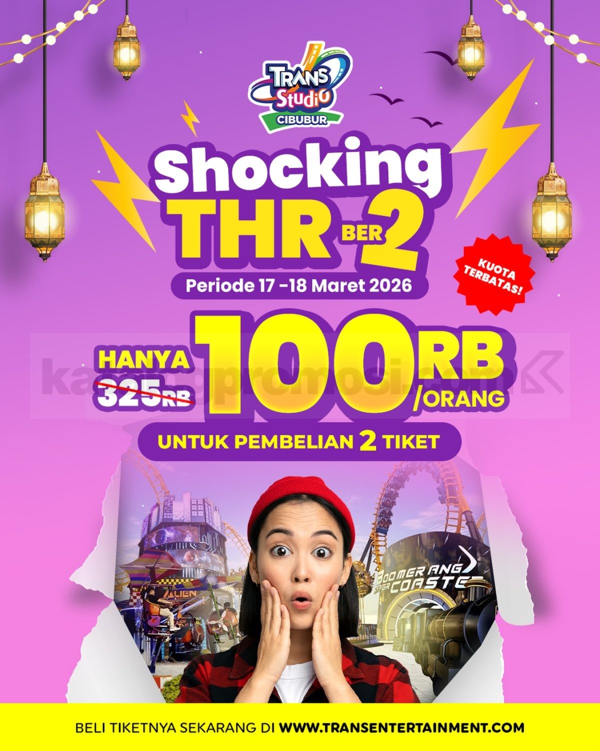 Promo Trans Studio Cibubur Shocking THR Tiket Rp. 100.000 per orang dengan minimal pembelian 2 tiket berlaku mulai tanggal 17 Maret 2026 – 18 Maret 2026.