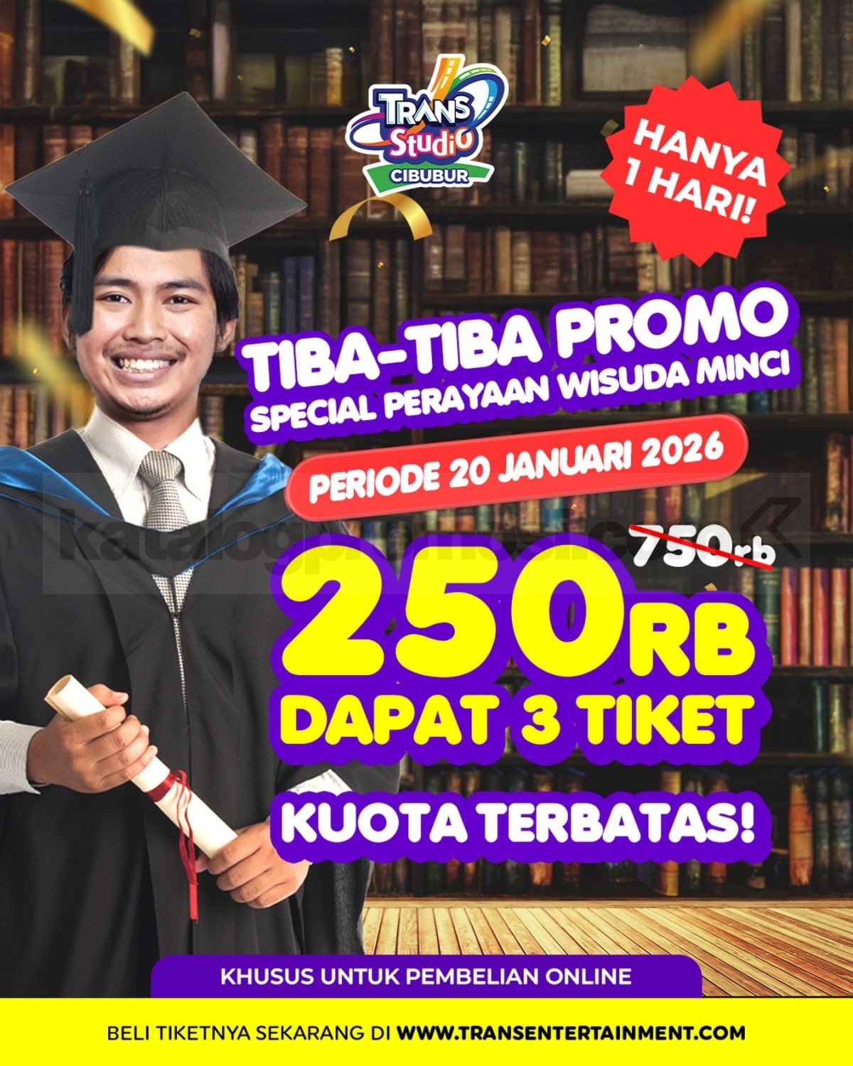 Promo Trans Studio Cibubur Spesial Wisuda Minci 3 tiket Rp. 250.000 untuk pembelian online, berlaku mulai tanggal 20 Januari 2026 di Trans Studio Cibubur.