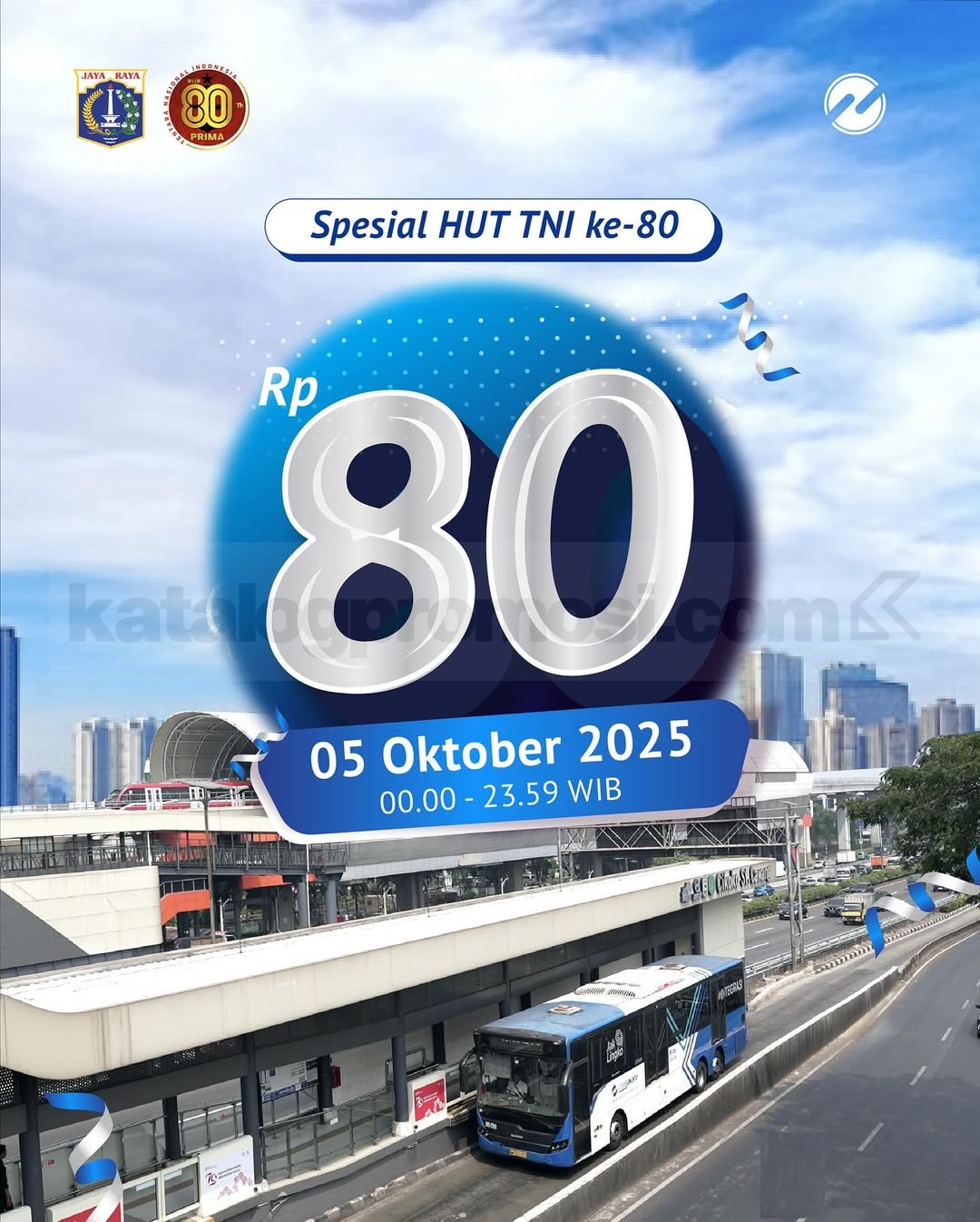 Promo Transjakarta HUT TNI Ke-80 Tarif Spesial Rp80 untuk keliling Jakarta seharian, berlaku mulai tanggal 5 Oktober 2025 di seluruh layanan Transjakarta.
