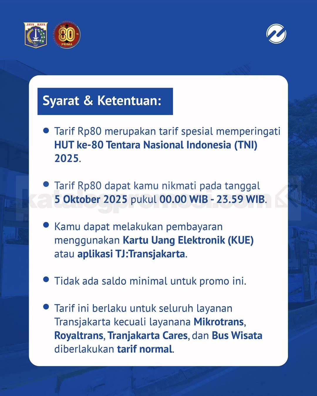 ๐ Cek gambar promo Transjakarta HUT TNI ke-80 di bawah ini untuk lihat info lengkap tarif Rp80 dan detail cara pembayarannya!