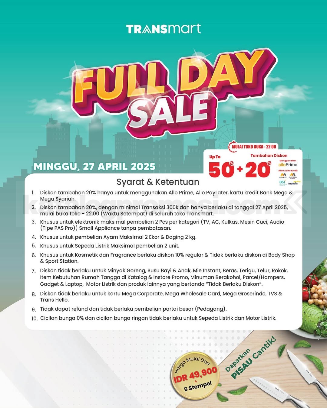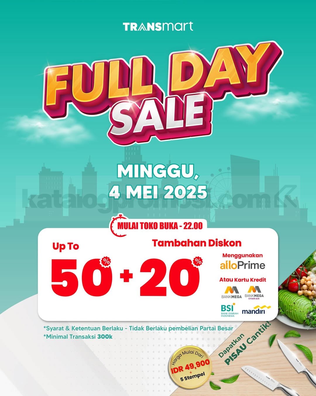 Promo Transmart Full Day Sale, diskon hingga 50% + hingga 20% dengan Bank Mega, Allo Bank, & Livinβ Mandiri. Berlaku Minggu, 06 Juli 2025!