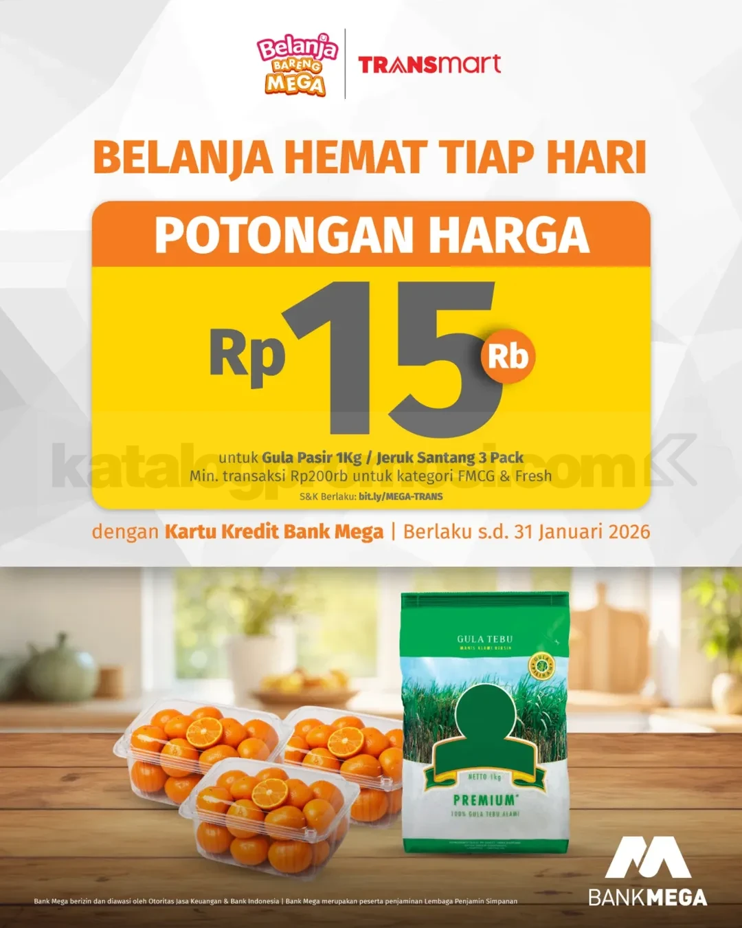 Promo Transmart Kebutuhan Harian & Buah Diskon Rp. 15.000 dengan belanja minimal Rp. 200.000 pakai kartu kredit Bank Mega, berlaku mulai tanggal 19 Januari 2026 – 31 Januari 2026 di seluruh outlet