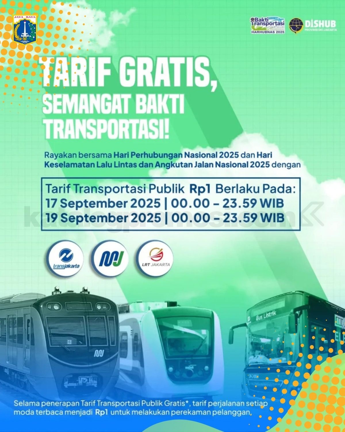 Promo transportasi publik Rp1 spesial Hari Perhubungan Nasional 2025 berlaku 17 & 19 September 2025 di Jakarta untuk Transjakarta, MRT, dan LRT.