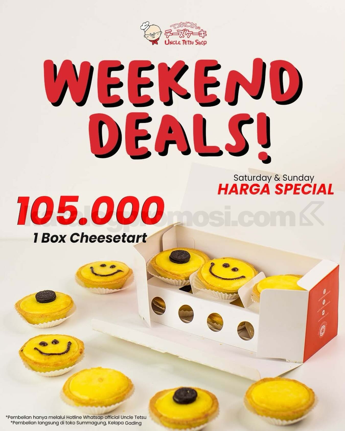 Promo Uncle Tetsu Shop Weekend Deals 1 Box Cheesetart Rp. 105.000 setiap Sabtu dan Minggu pembelian melalui Hotline WhatsApp official atau langsung di toko Summagung Kelapa Gading.