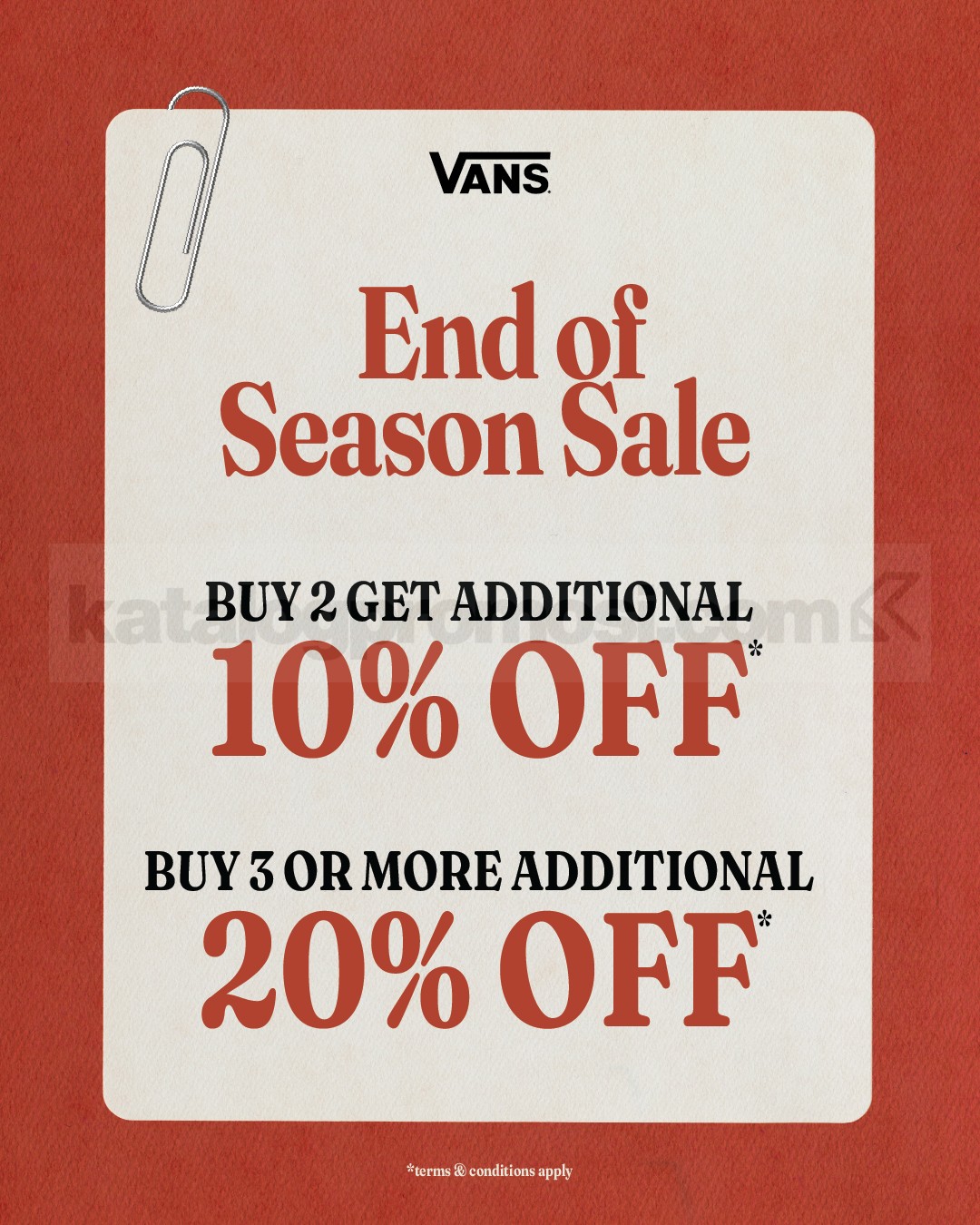 Promo Vans End of Season Sale extra diskon hingga 20% berlaku hingga 4 Januari 2026, tambahan potongan harga berdasarkan jumlah pembelian di seluruh store Vans Indonesia