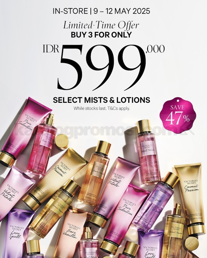 Promo Victoria’s Secret Mist & Lotion Buy 3 For Only Rp599.000! berlaku 9–12 Mei 2025, di semua toko & website resmi!