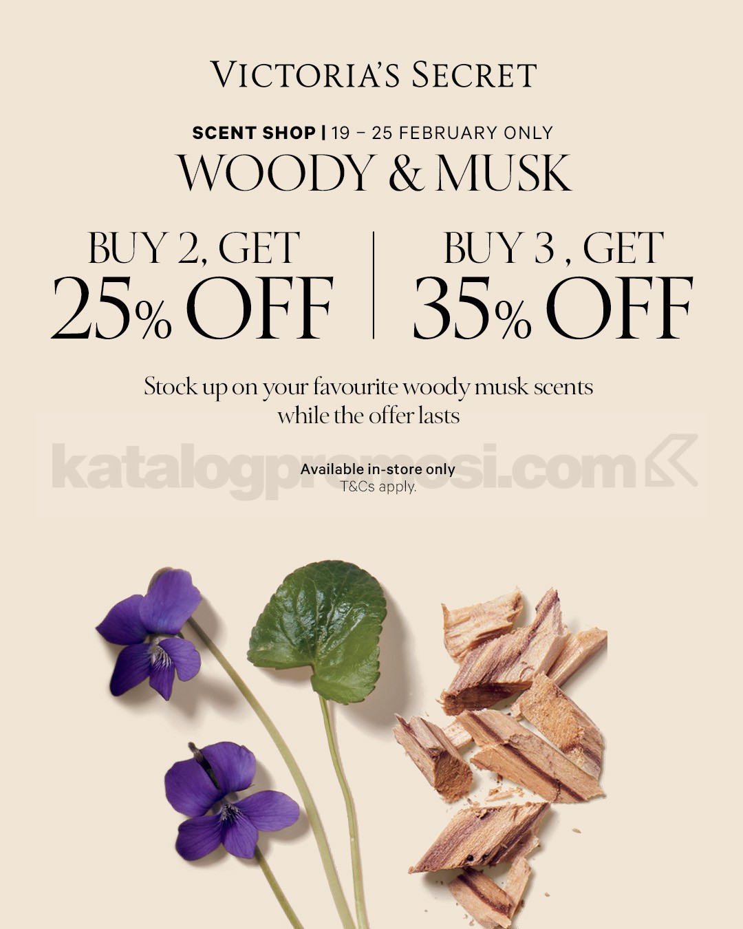 Promo Victoria’s Secret Woody & Musk Scent Shop berlaku 19 – 25 Februari 2026 dengan Buy 2 diskon 25% dan Buy 3 diskon 35% khusus in-store.