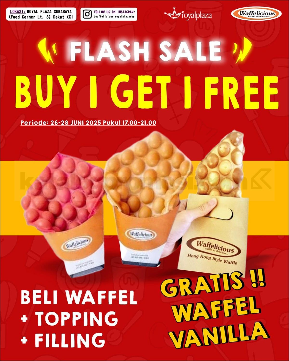 Hanya berlaku di outlet Waffelicious Lawu Plaza Madiun, Sunrise Mall Mojokerto, Suncity Sidoarjo, dan Superindo Manukan Surabaya.