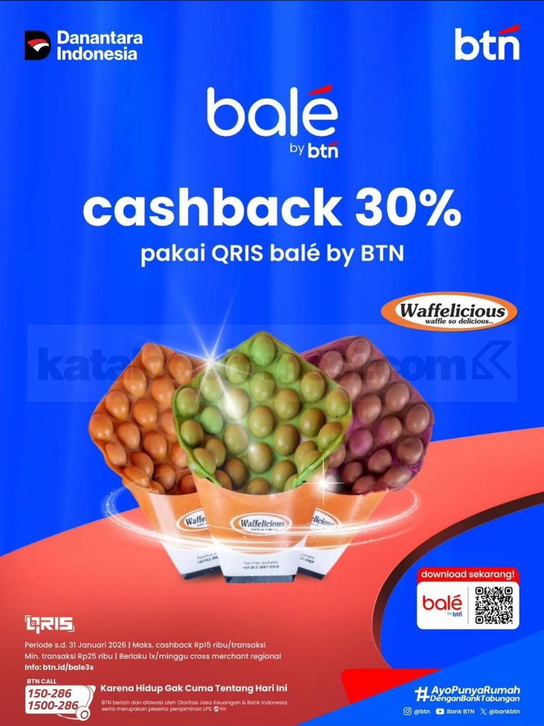 Promo Waffelicious Cashback 30% Qris balé by BTN berlaku hingga 31 Januari 2026.