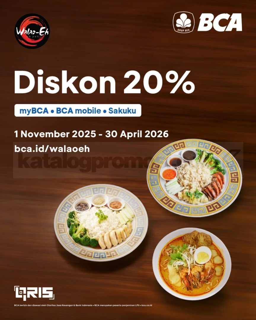 Promo Walao-Eh Spesial BCA Diskon 20% Semua Menu, bayar via QRIS myBCA min Rp150.000 weekday berlaku 1 November 2025 – 30 April 2026.