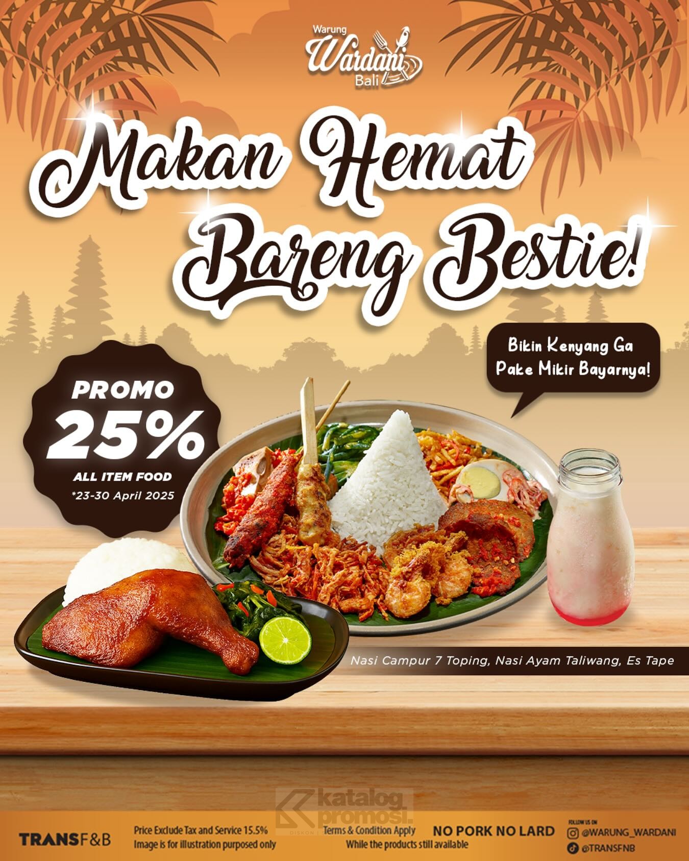 Gak cuma Warung Wardani loh, promo ini juga berlaku di tempat hits lainnya kayak Baskin Robbins, The Coffee Bean, Wendy’s, Gyukatsu Nikaido, Tasty Kitchen, dan lainnya. Tapi khusus buat kamu yang nge-fans berat sama cita rasa Bali yang khas, ini saatnya makan puas dan tetap hemat!