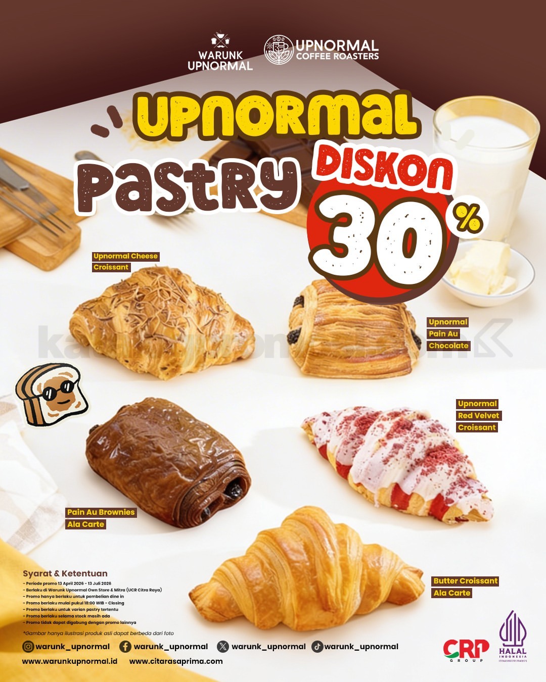 Promo Warunk Upnormal Pastry Diskon 30% pilihan pastry favorit untuk dine in berlaku mulai tanggal 13 April 2026 – 13 Juli 2026 di outlet tertentu