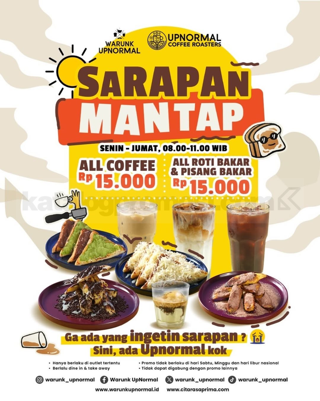 Promo Warunk Upnormal Sarapan Mantap mulai Rp. 15.000 menu kopi dan roti bakar untuk pagi hemat berlaku selama persediaan masih ada di lokasi tertentu