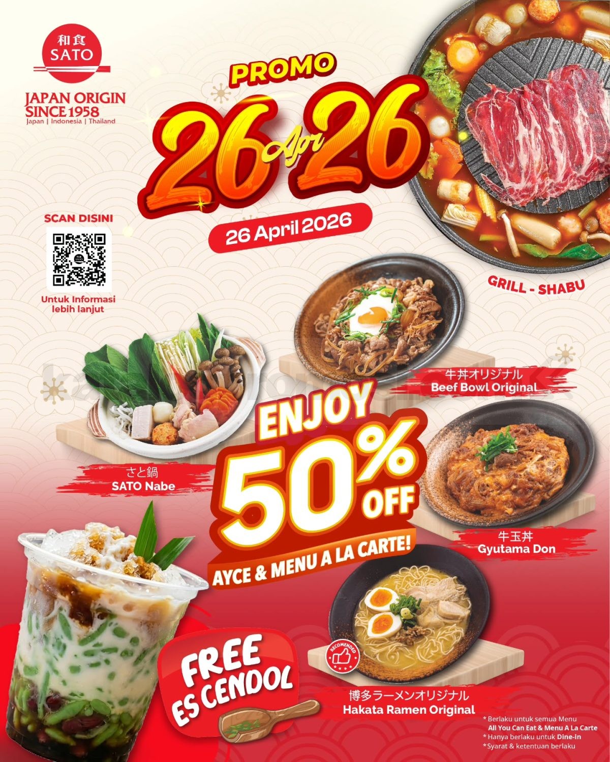 Promo Washoku Sato Diskon 50% AYCE & Menu Ala Carte gratis es cendol untuk dine-in berlaku 26 April 2026 di SATO Batu Tulis.