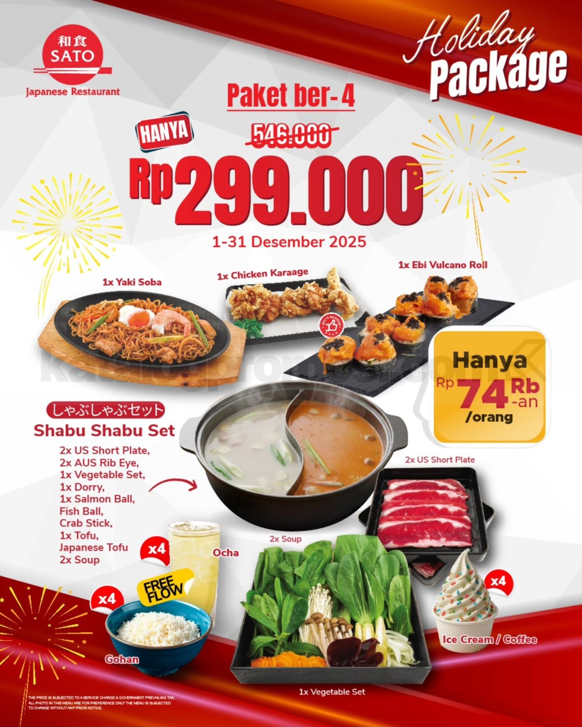 Promo Washoku Sato Holiday Package Rp. 299.000 untuk paket ber-4 dengan menu lengkap dan free flow gohan berlaku 1–31 Desember 2025 di Washoku Sato Jakarta.
