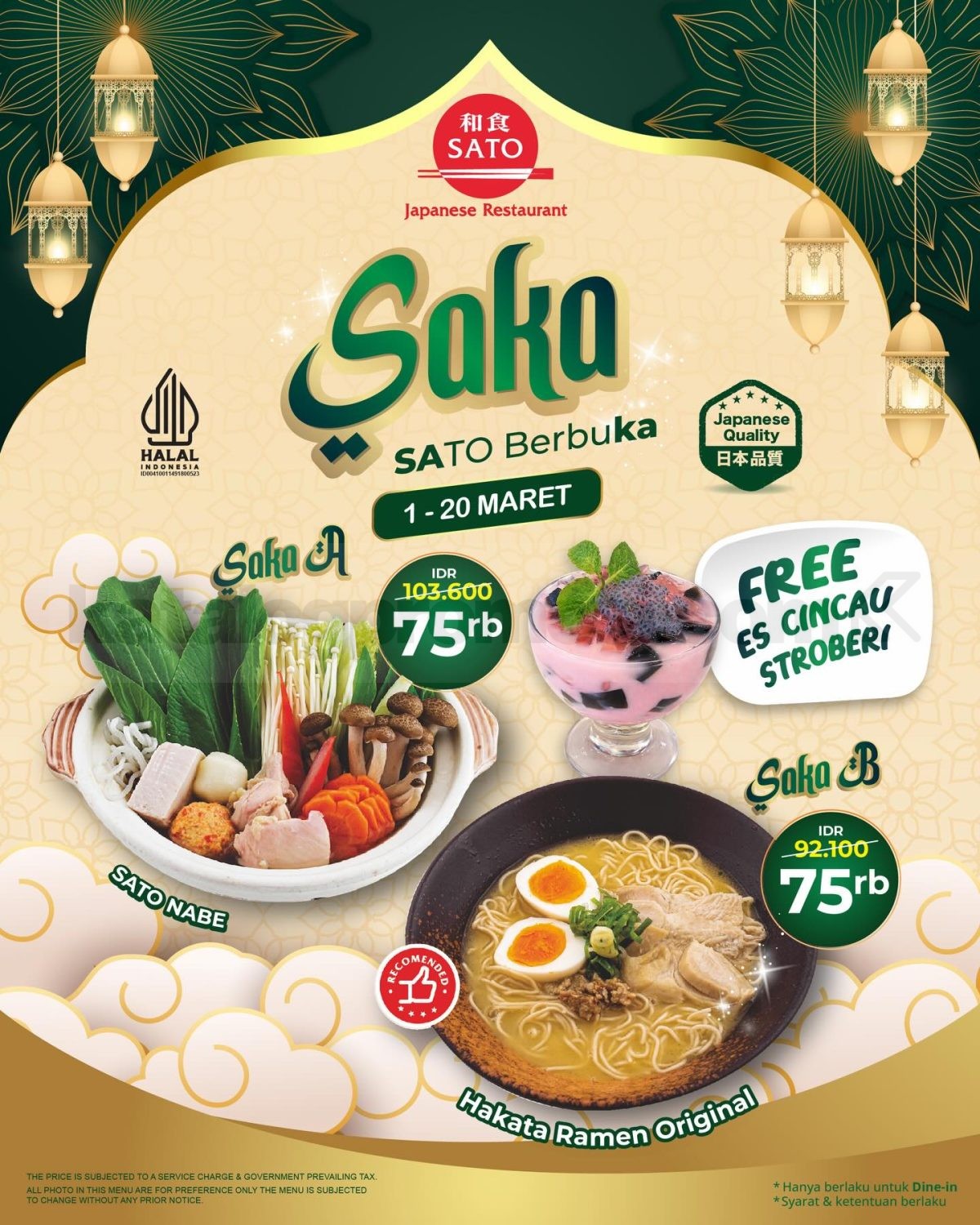 Promo Washoku Sato Saka Sato Berbuka Rp. 75.000 dengan free es cincau stroberi setiap paket, berlaku mulai tanggal 1 Maret 2026 – 20 Maret 2026 di SATO Batu Tulis.