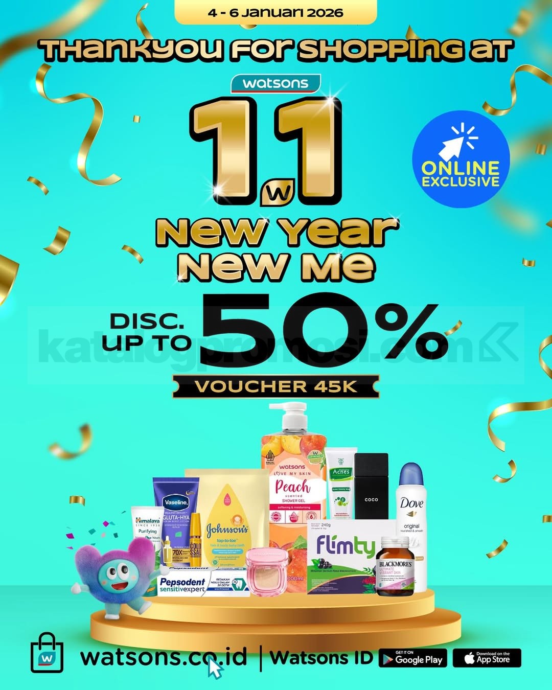 Promo Watsons 1.1 New Year New Me diskon hingga 50% + voucher Rp. 45.000 untuk belanja online, berlaku mulai tanggal 4 Januari 2026 – 6 Januari 2026
