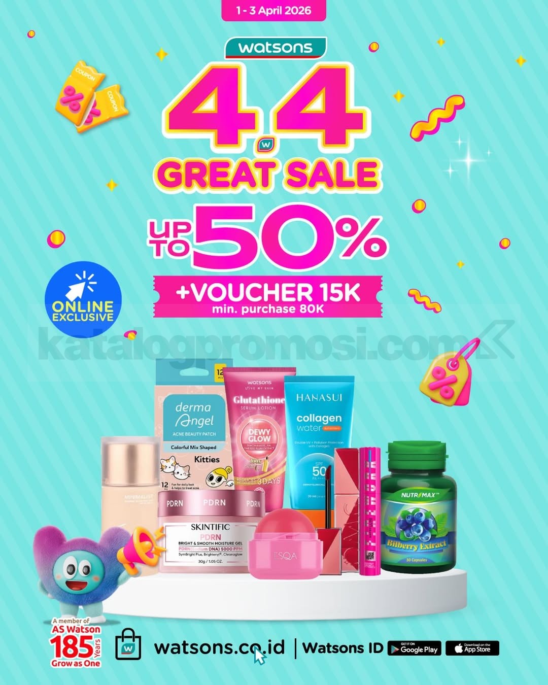 Promo Watsons 4.4 Great Sale diskon hingga 50% + voucher Rp. 15.000 belanja online berlaku mulai tanggal 1 April 2026 – 3 April 2026.