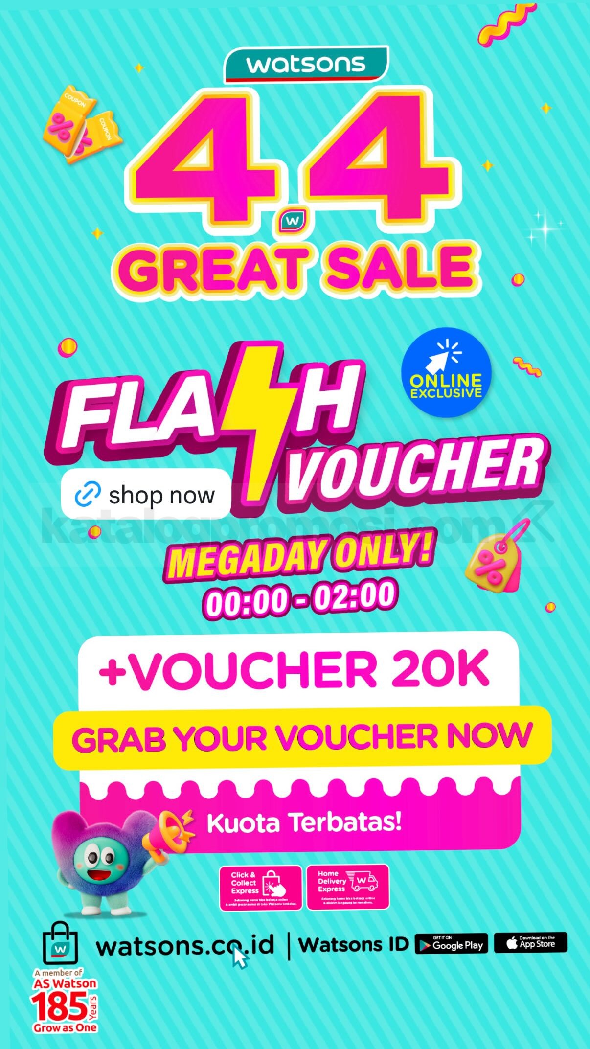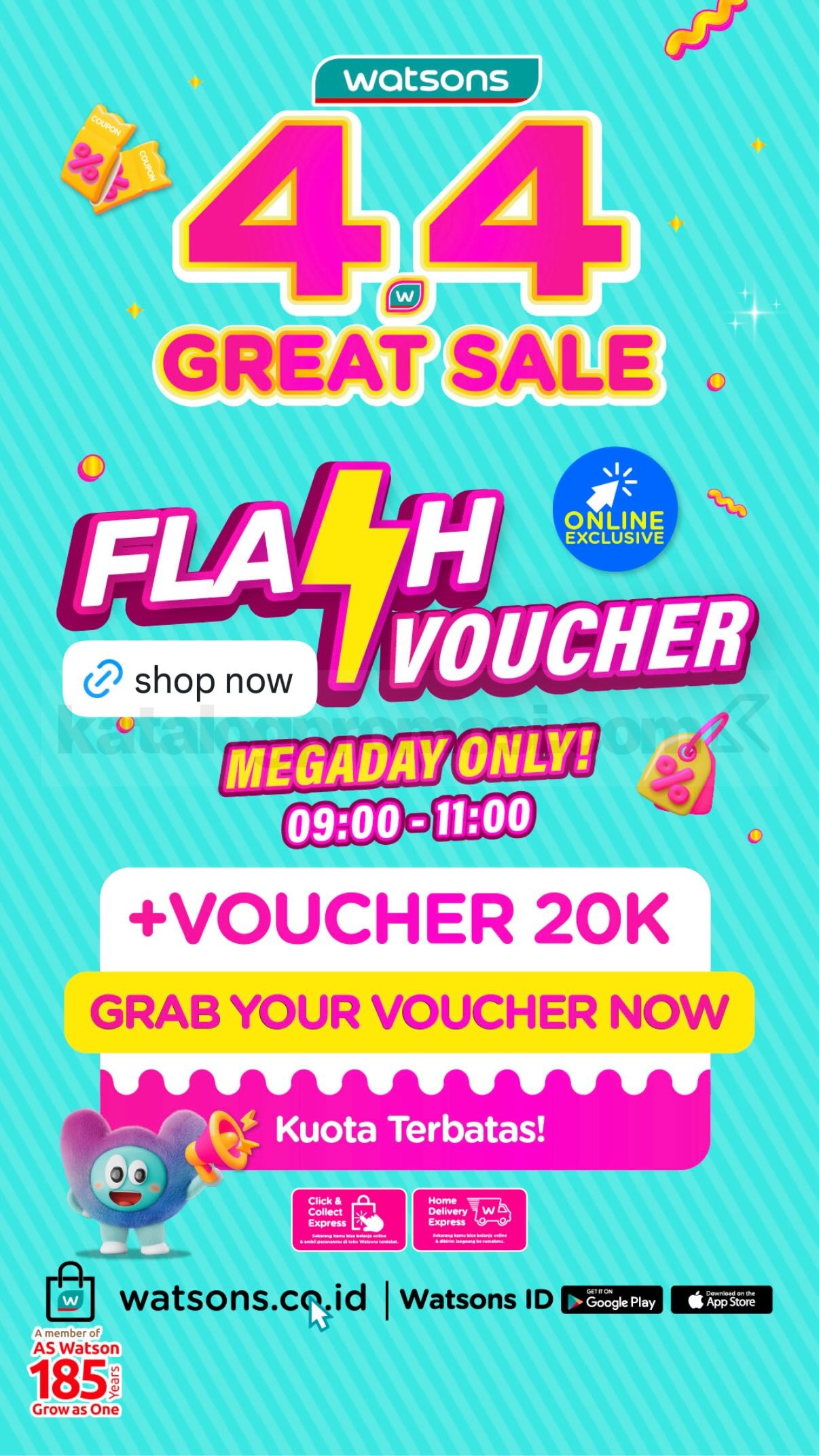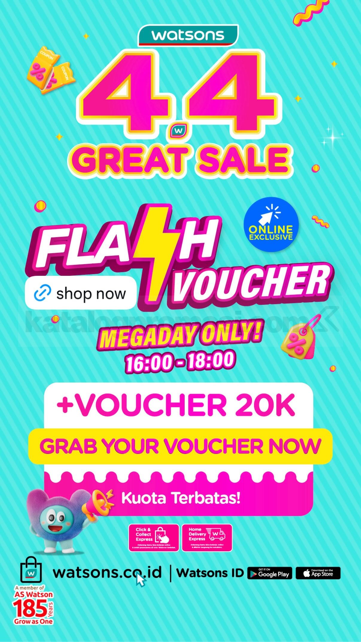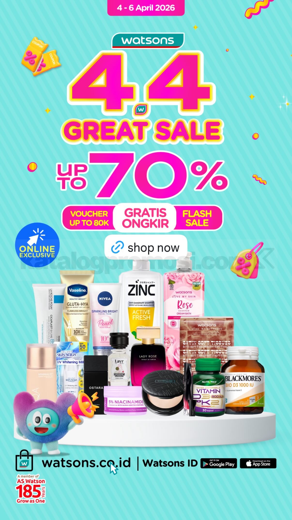 Promo Watsons 4.4 Great Sale Diskon hingga 70% hanya 1 hari, tanggal 4 April 2026 untuk pembelian online dengan tambahan voucher hingga Rp. 80.000, gratis ongkir, dan flash voucher harian.