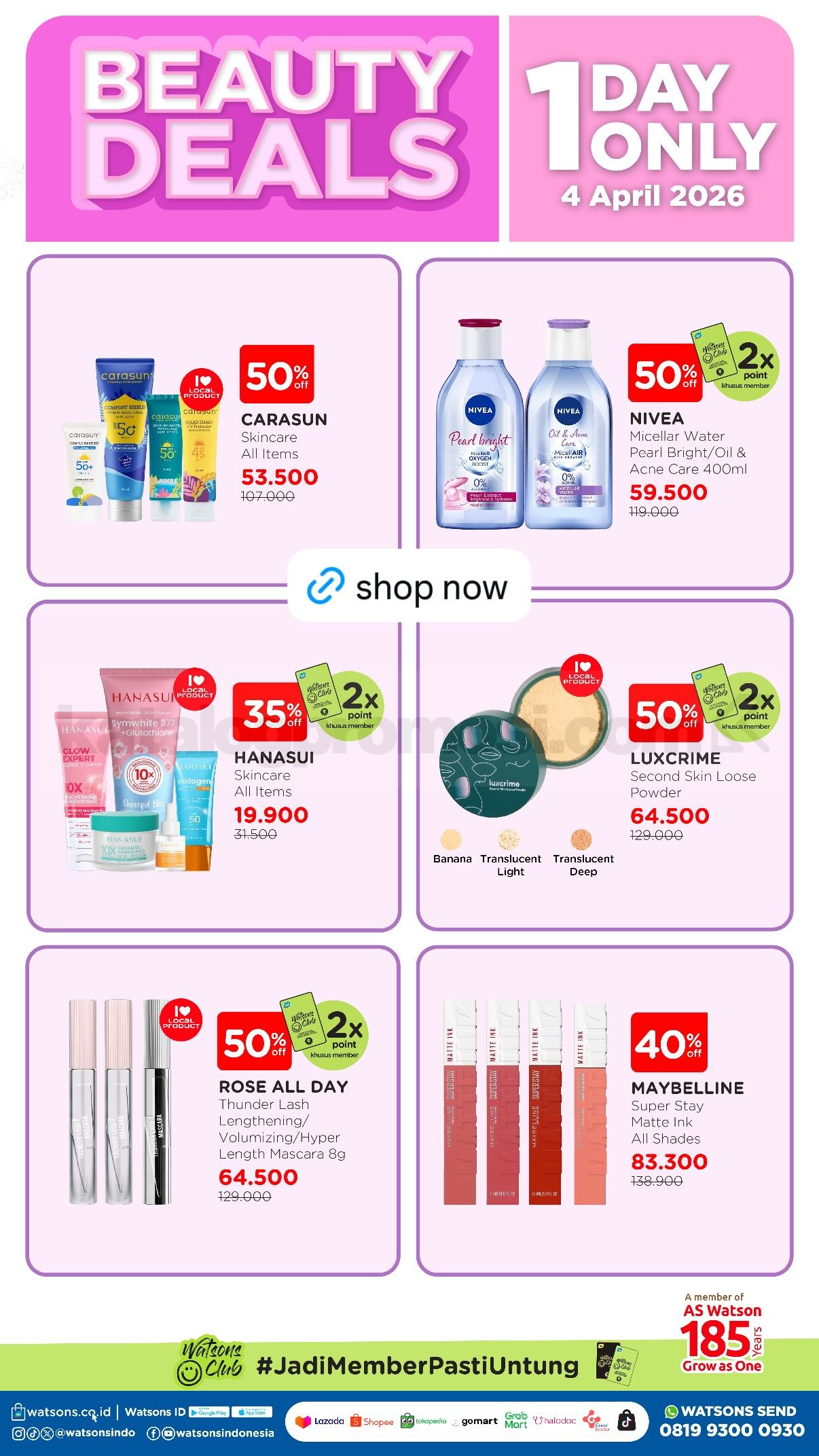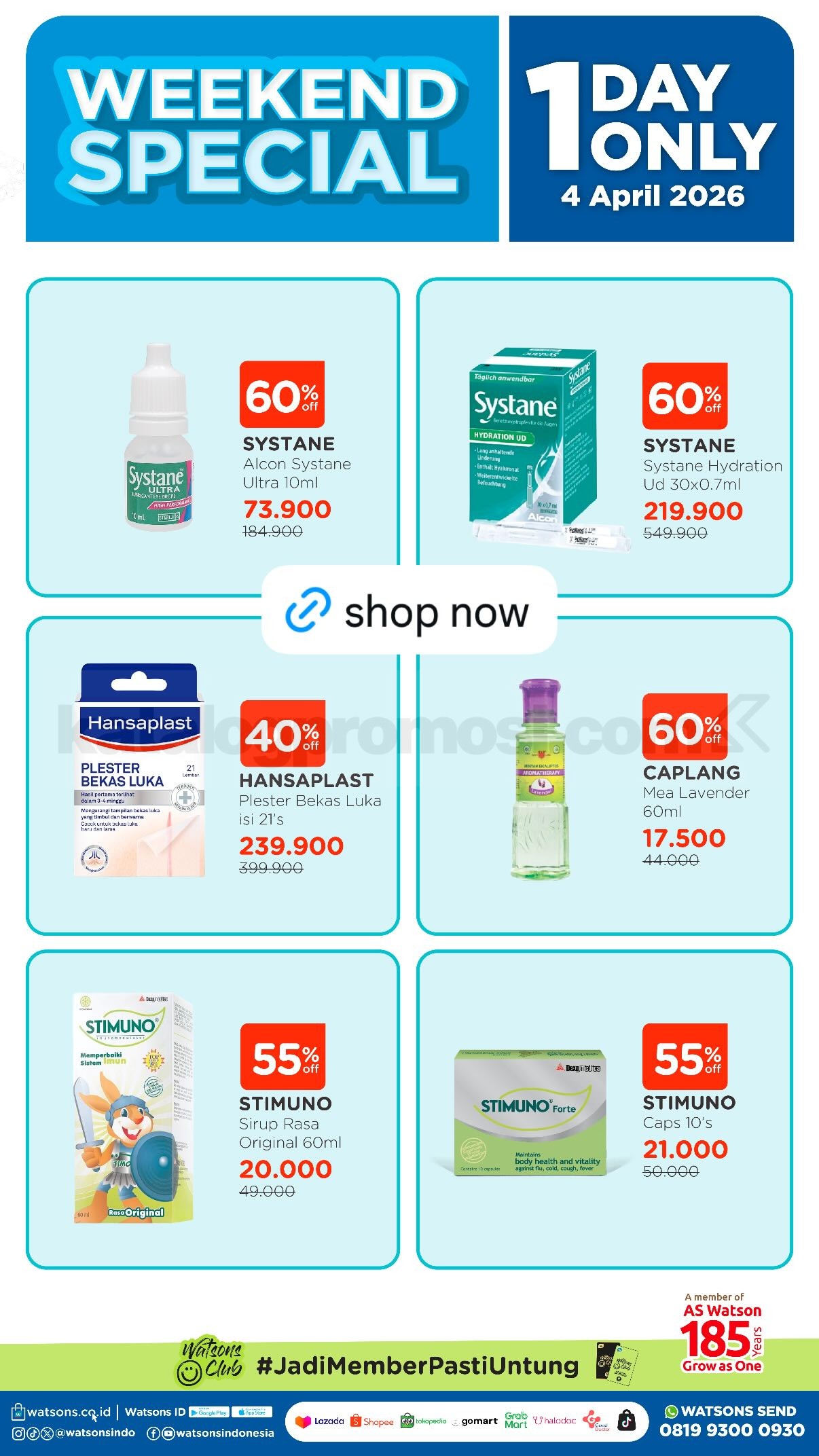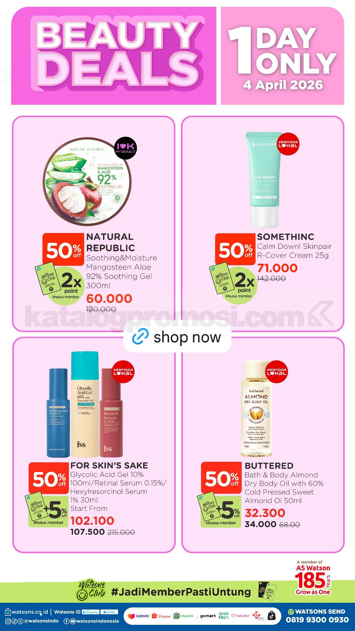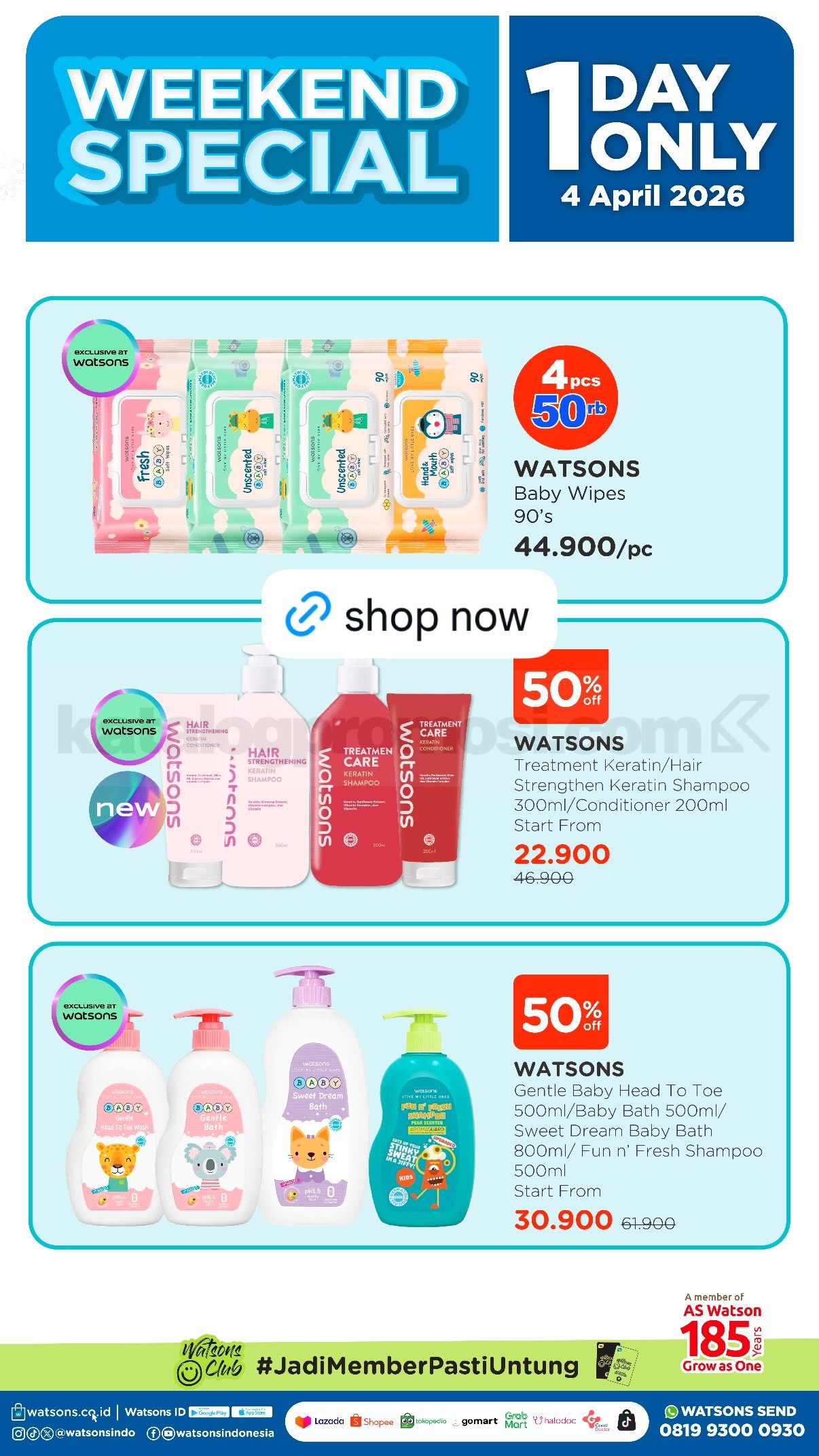 Promo tersedia khusus online dan puncaknya berlangsung hanya 1 hari, tanggal 4 April 2026. Semua transaksi dilakukan melalui platform online Watsons sesuai periode tersebut.
