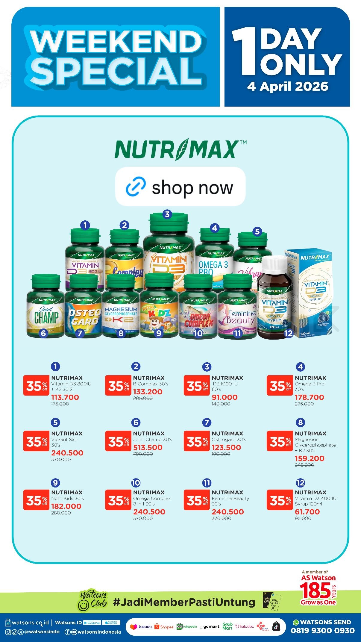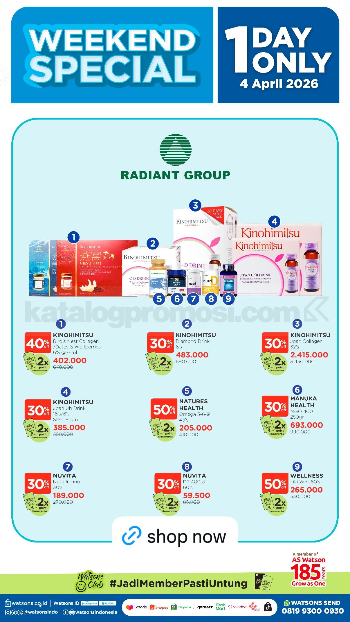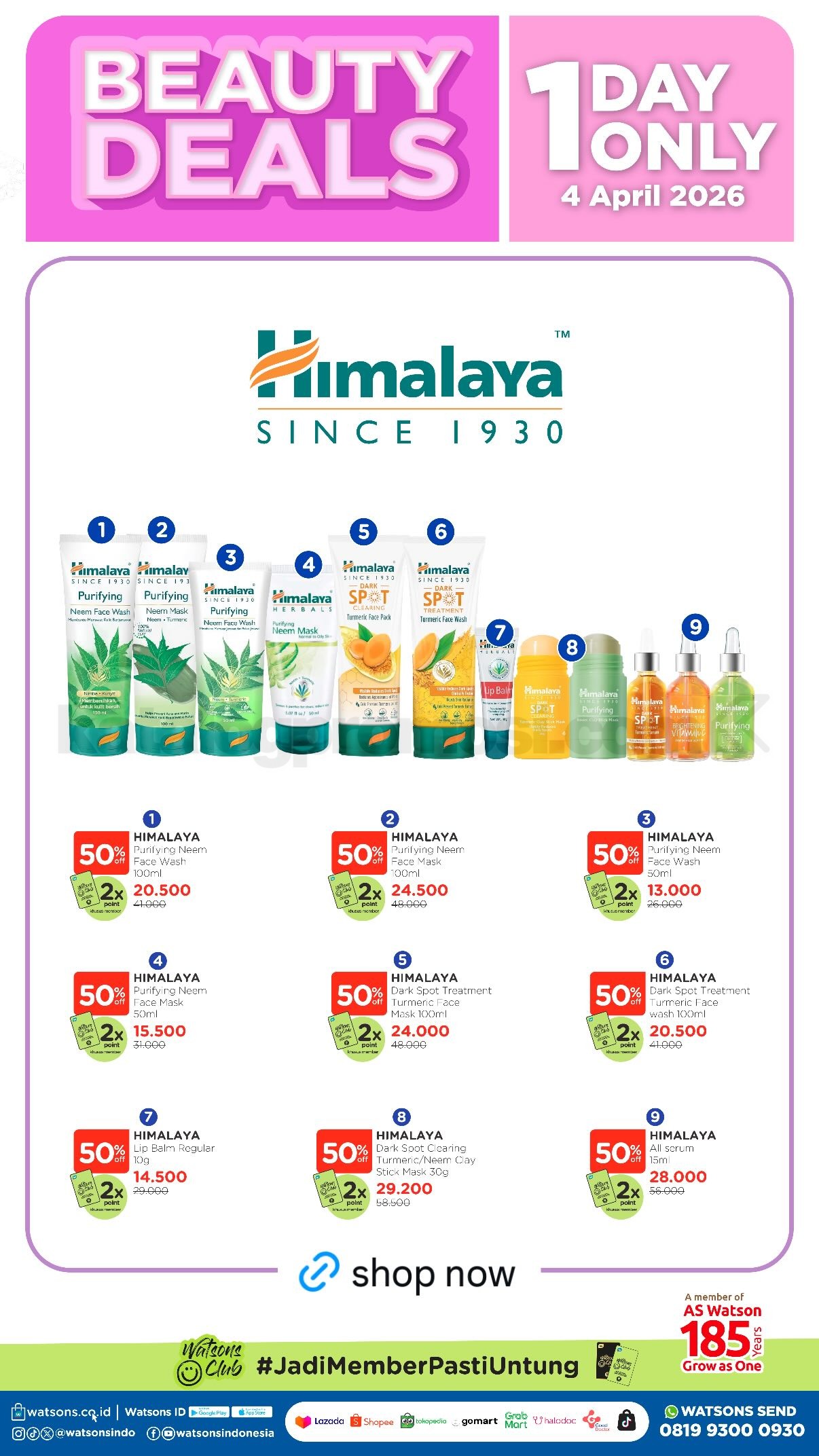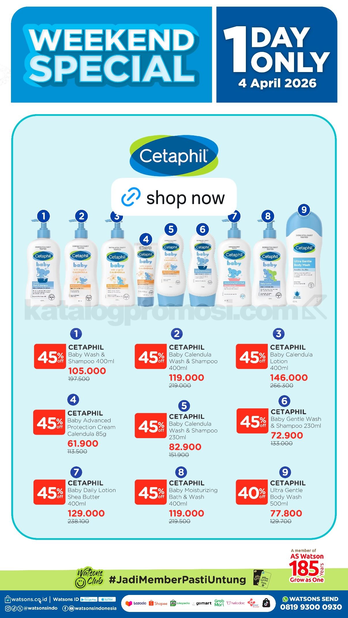 Promo tersedia khusus online dan puncaknya berlangsung hanya 1 hari, tanggal 4 April 2026. Semua transaksi dilakukan melalui platform online Watsons sesuai periode tersebut.