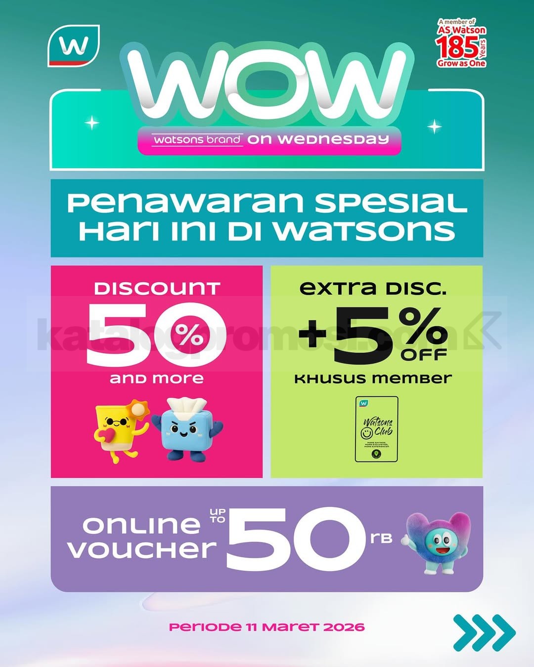 Promo Watsons Brand on Wednesday diskon 50% produk pilihan dengan ekstra diskon member dan voucher hingga Rp. 50.000 berlaku mulai tanggal 11 Maret 2026.