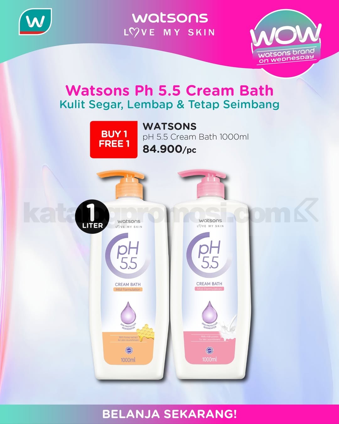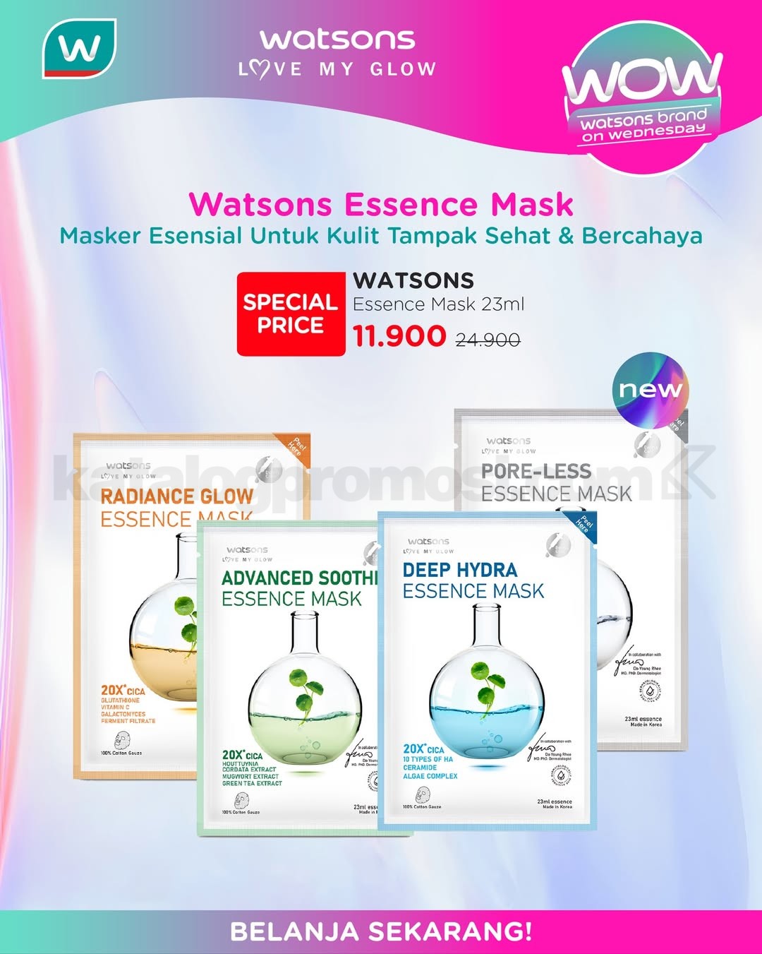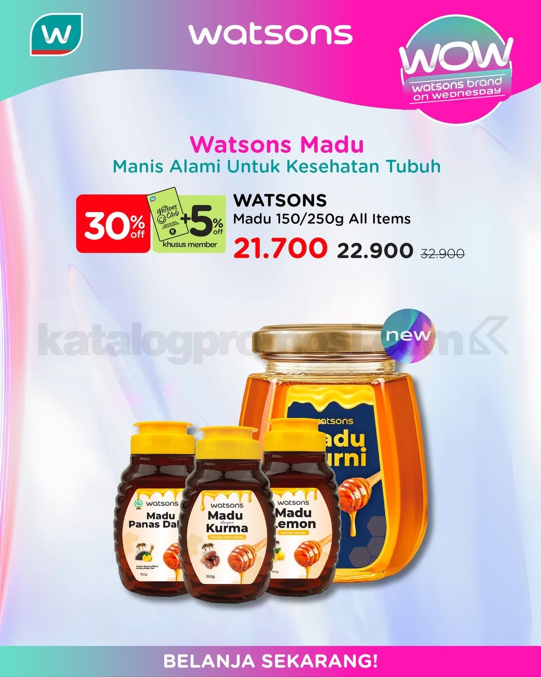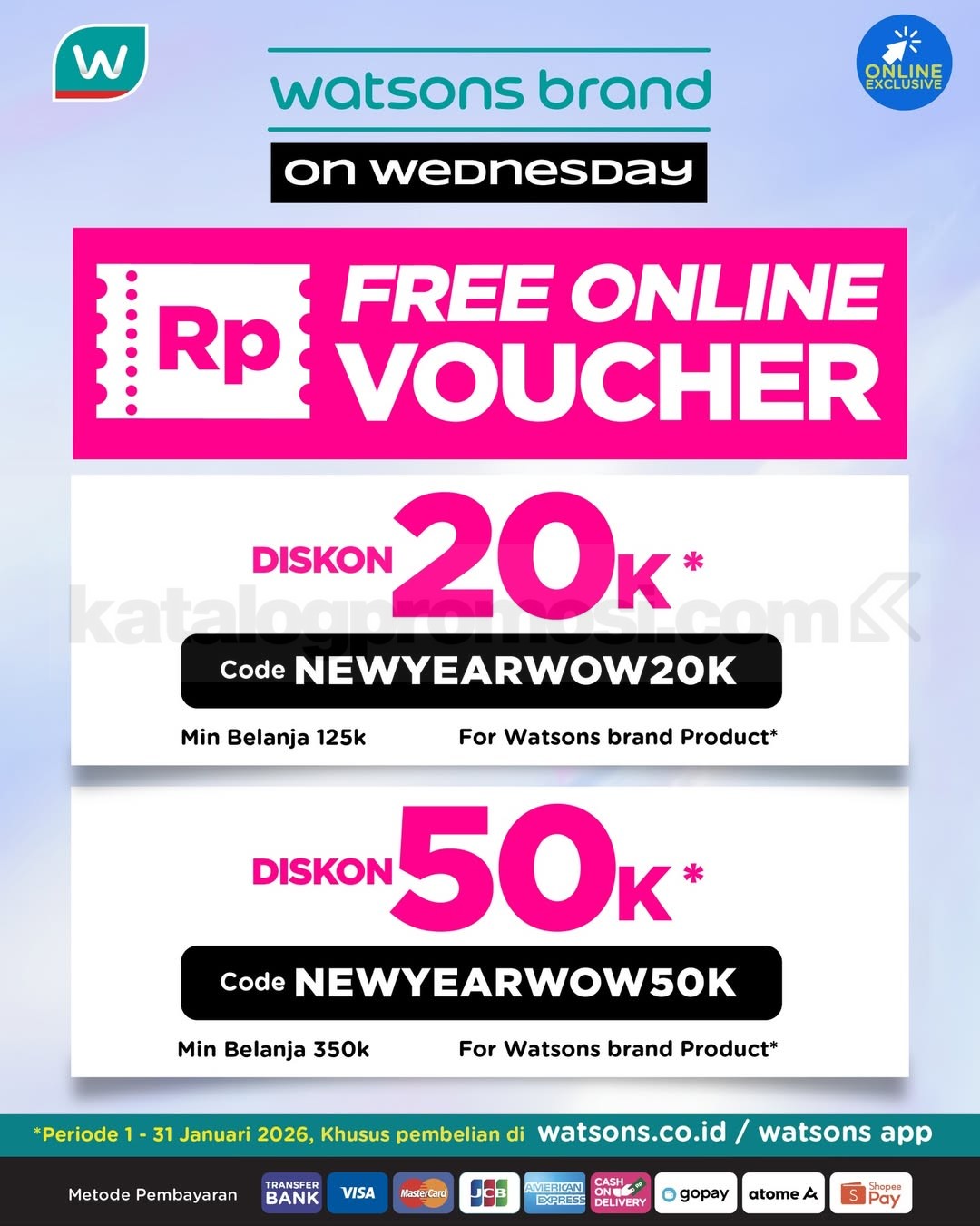 Belanja bisa online di watsons.co.id atau melalui aplikasi Watsons, atau langsung ke store terdekat. Nikmati bonus poin member: Reguler 2x poin, Elite 5x poin. Tambahan voucher belanja online eksklusif: Rp. 20.000 off dengan kode NEWYEARWOW20K untuk minimal belanja Rp. 125.000 dan Rp. 50.000 off dengan kode NEWYEARWOW50K untuk minimal belanja Rp. 350.000, berlaku untuk produk Watsons Brand.