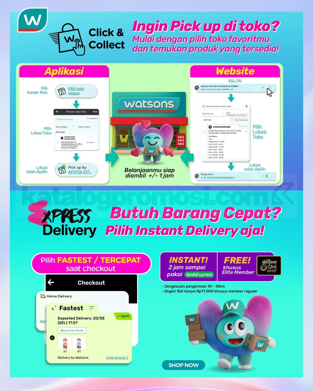 Selain itu, Watsons menyediakan layanan Click & Collect, di mana pelanggan dapat memilih toko favorit melalui aplikasi atau website dan mengambil belanjaannya dalam waktu sekitar 1 jam. Untuk pengiriman cepat, tersedia Express Delivery menggunakan GrabExpress dengan jangkauan 10–15 km. Biaya flat instan hanya Rp. 17.000 untuk member reguler, sementara Watsons Club Elite Member bisa menikmati layanan ini gratis. Pelanggan cukup memilih opsi pengiriman “Fastest / Tercepat” saat checkout di aplikasi.