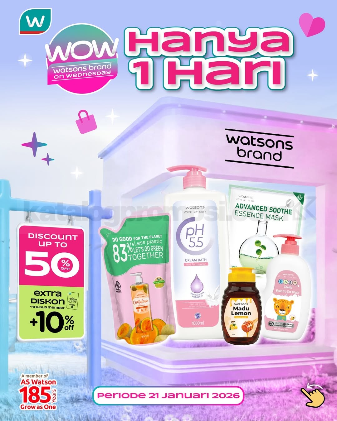 Promo Watsons On Wednesday diskon hingga 50% + extra 10% untuk member, belanja online/offline, berlaku tanggal 21 Januari 2026.