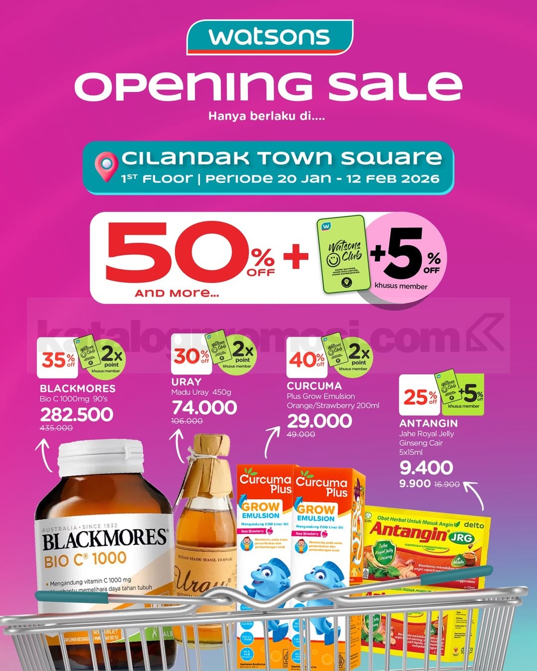 Promo Watsons Opening Sale Produk Kesehatan Diskon 50% + ekstra 5% member & bonus 2x Poin berlaku 20 Januari – 12 Februari 2026 di Cilandak Town Square.