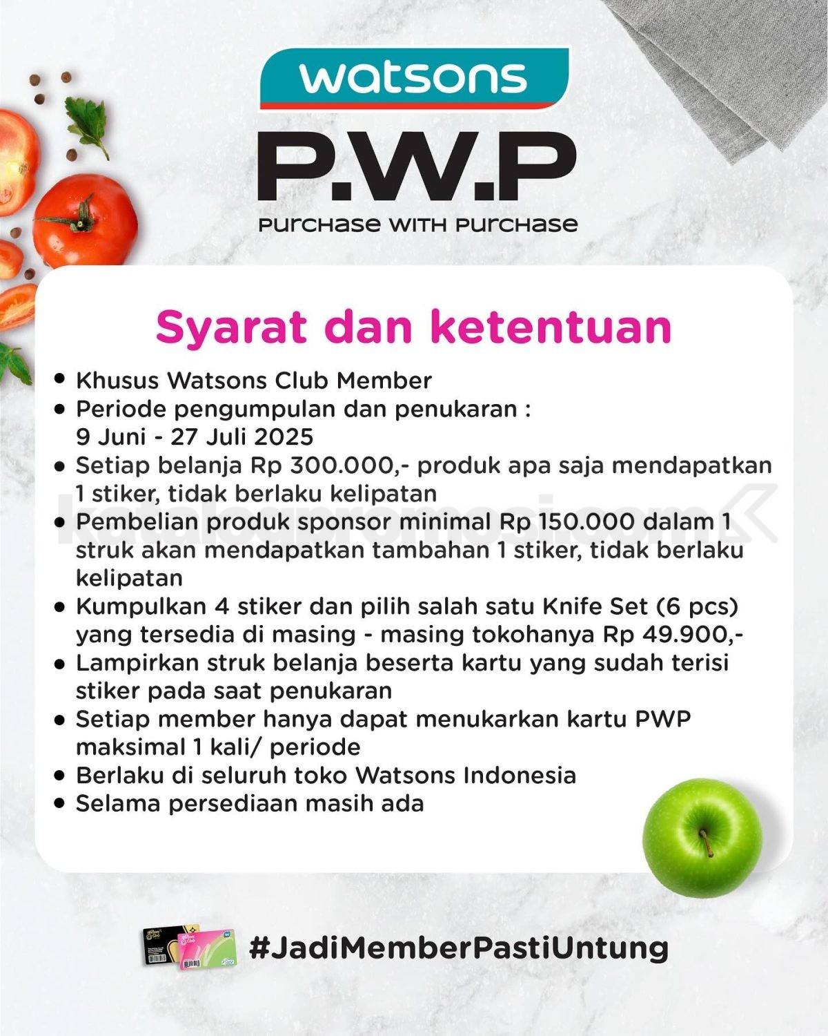 Promo Watsons P.W.P Knife Set Rp49.900 bisa kamu dapetin cuma dengan 4 stiker hasil belanja! Cukup belanja Rp300.000 dan kumpulin stikernya buat klaim 1 set pisau isi 6 pcs seharga Rp49.900 khusus untuk member Watsons Club. Promo berlaku 9 Juni – 27 Juli 2025 di seluruh toko Watsons Indonesia, selama persediaan masih ada.