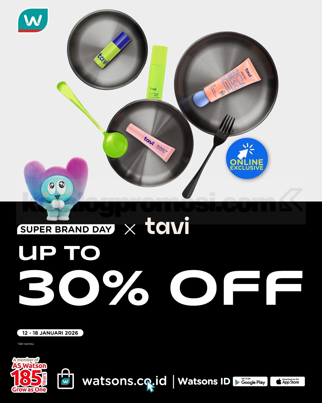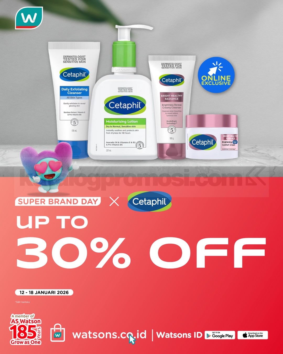 Promo Watsons Super Brand Day Tavi Cetaphil diskon hingga 30% untuk skincare dan makeup pilihan, belanja online dan nikmati benefit tambahan berlaku 12 Januari 2026 – 18 Januari 2026.