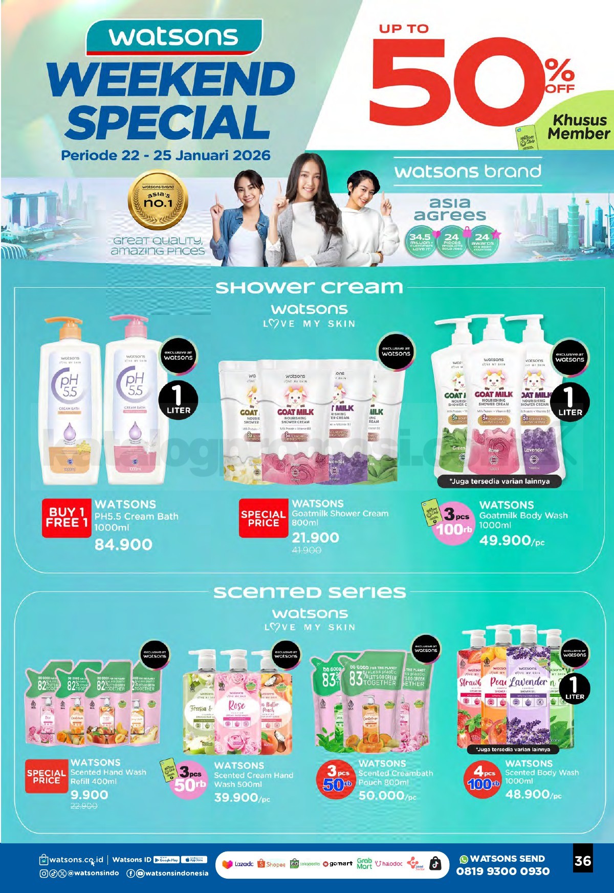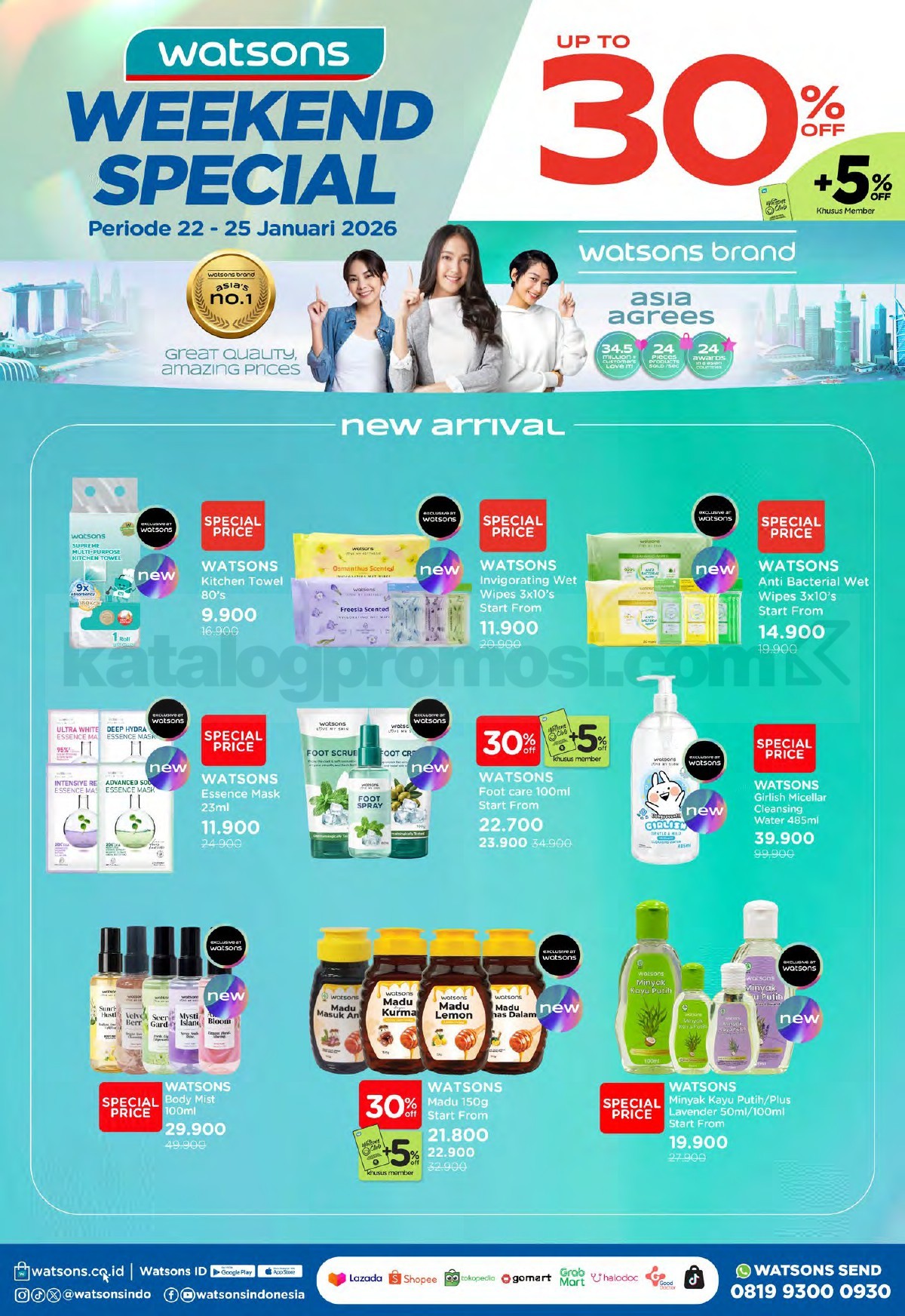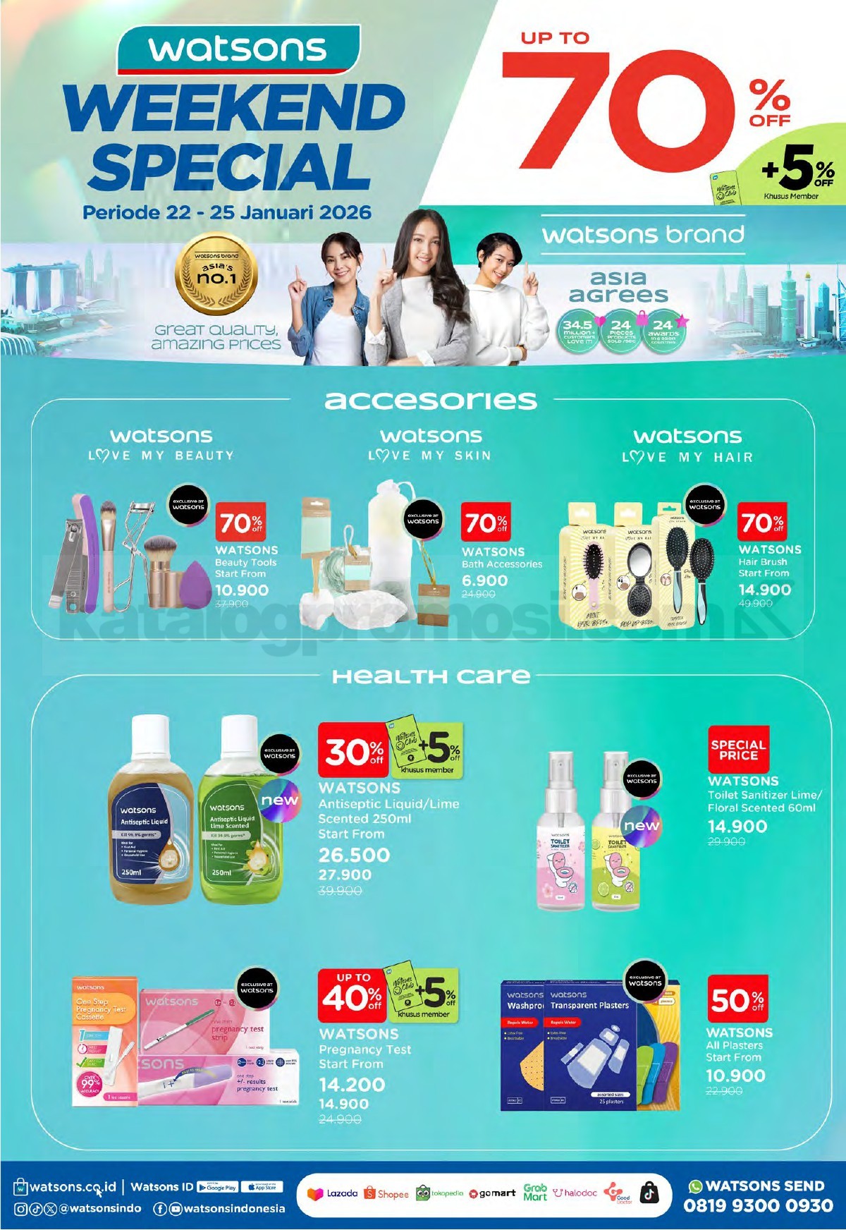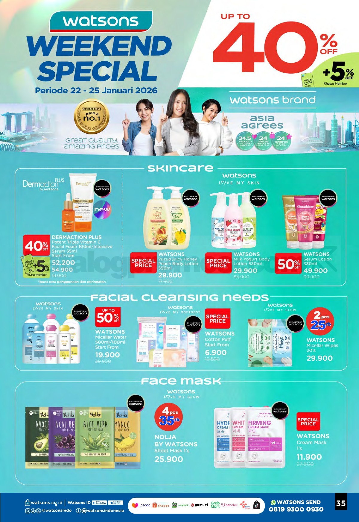 Promo Watsons Weekend Beauty Deals diskon 35% + voucher hingga Rp. 75.000 & ekstra diskon 5% member, berlaku mulai 22-25 Januari 2026 di seluruh outlet.