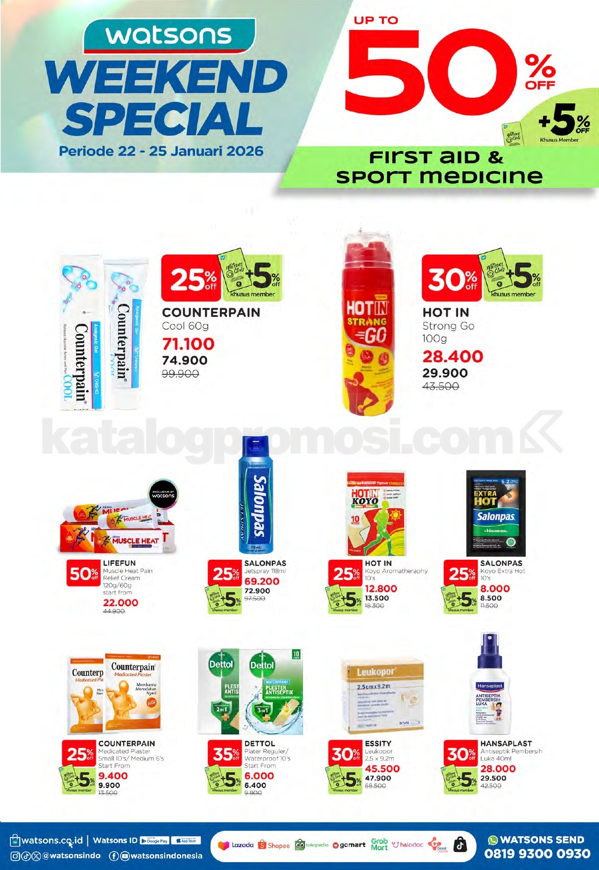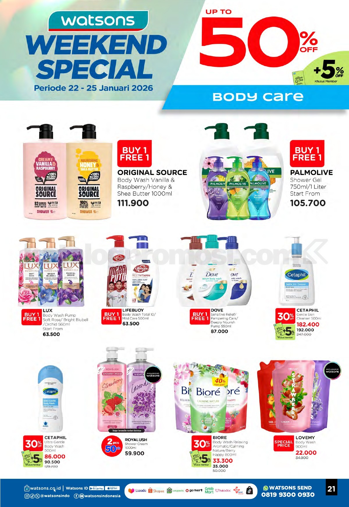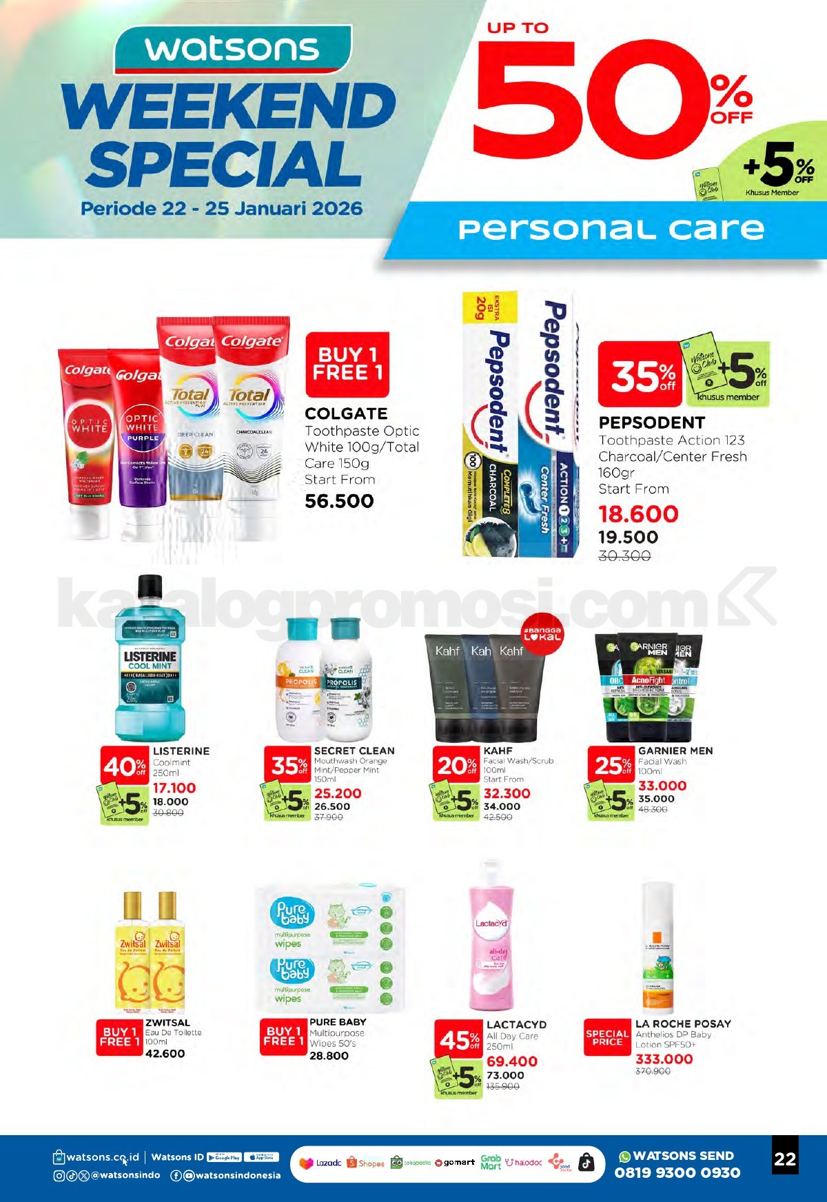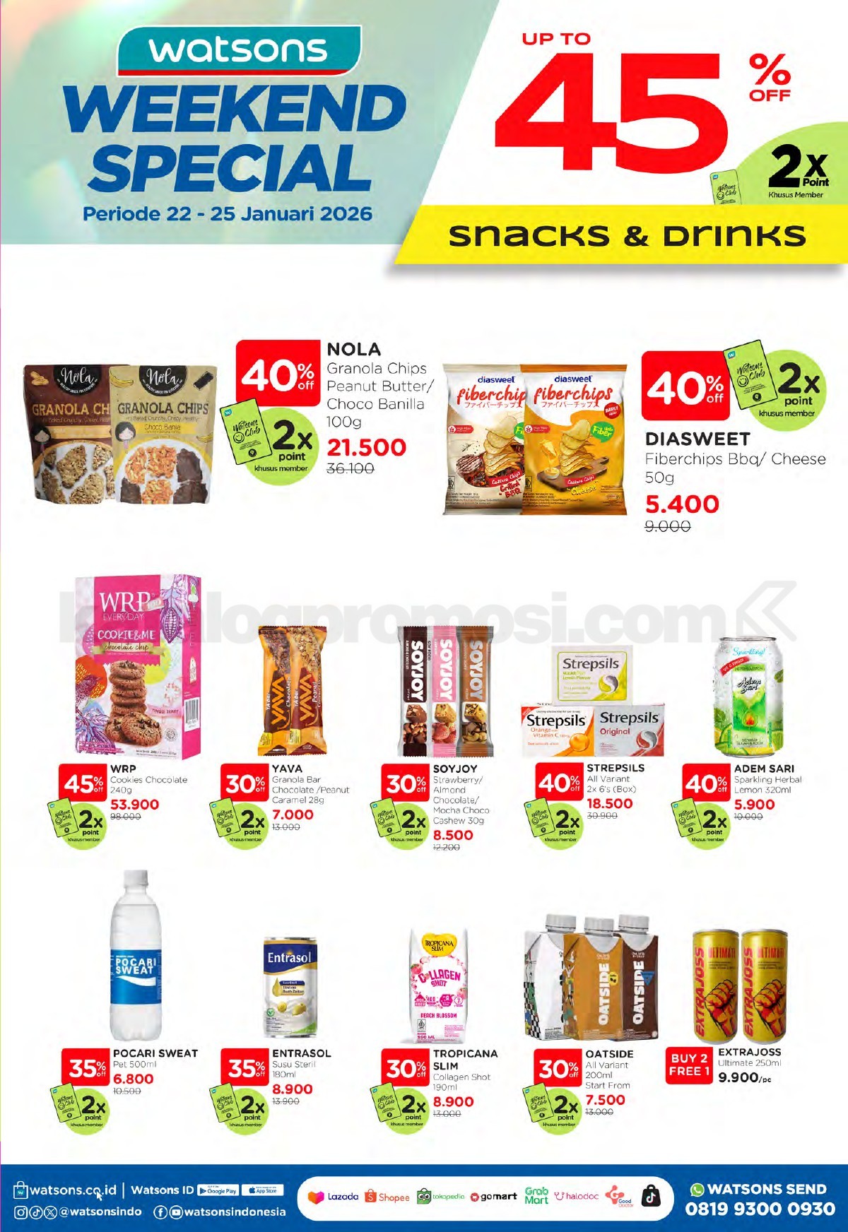 Promo Watsons Weekend Beauty Deals diskon 35% + voucher hingga Rp. 75.000 & ekstra diskon 5% member, berlaku mulai 22-25 Januari 2026 di seluruh outlet.