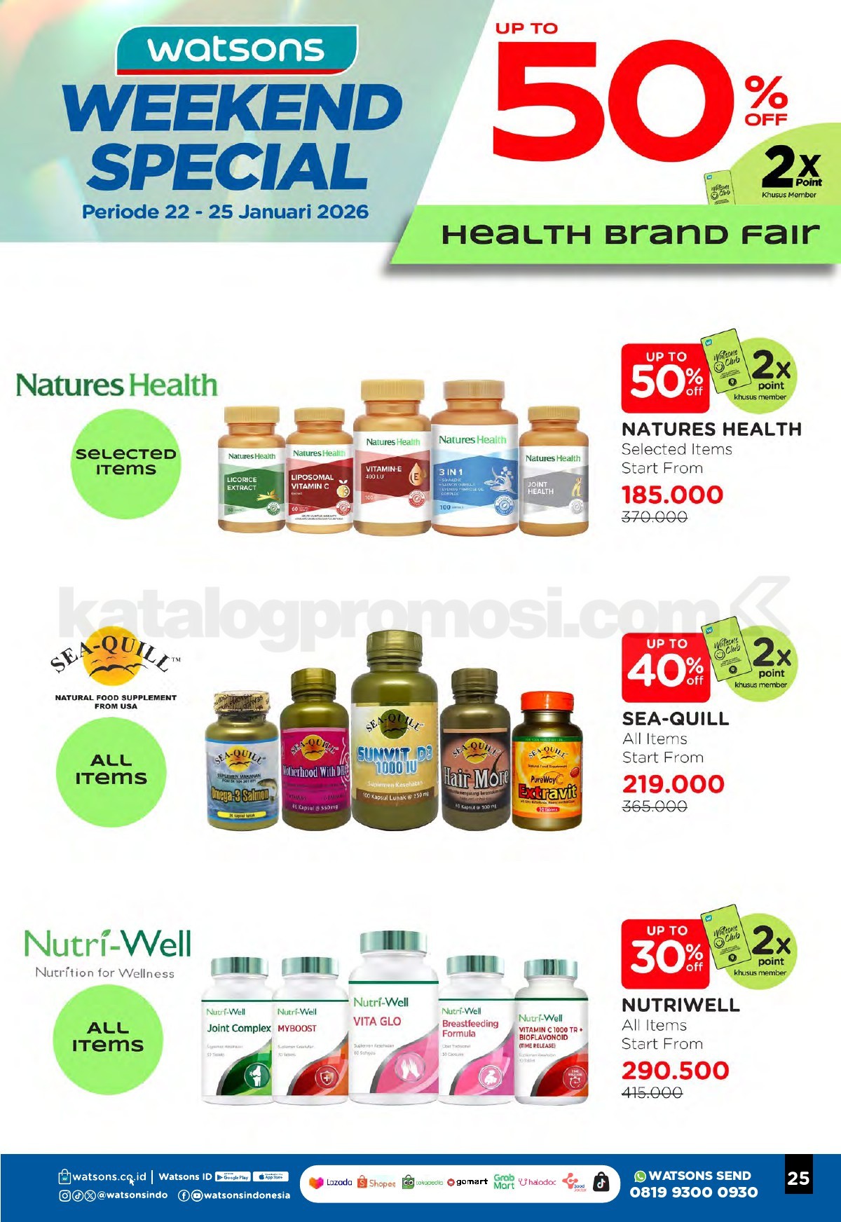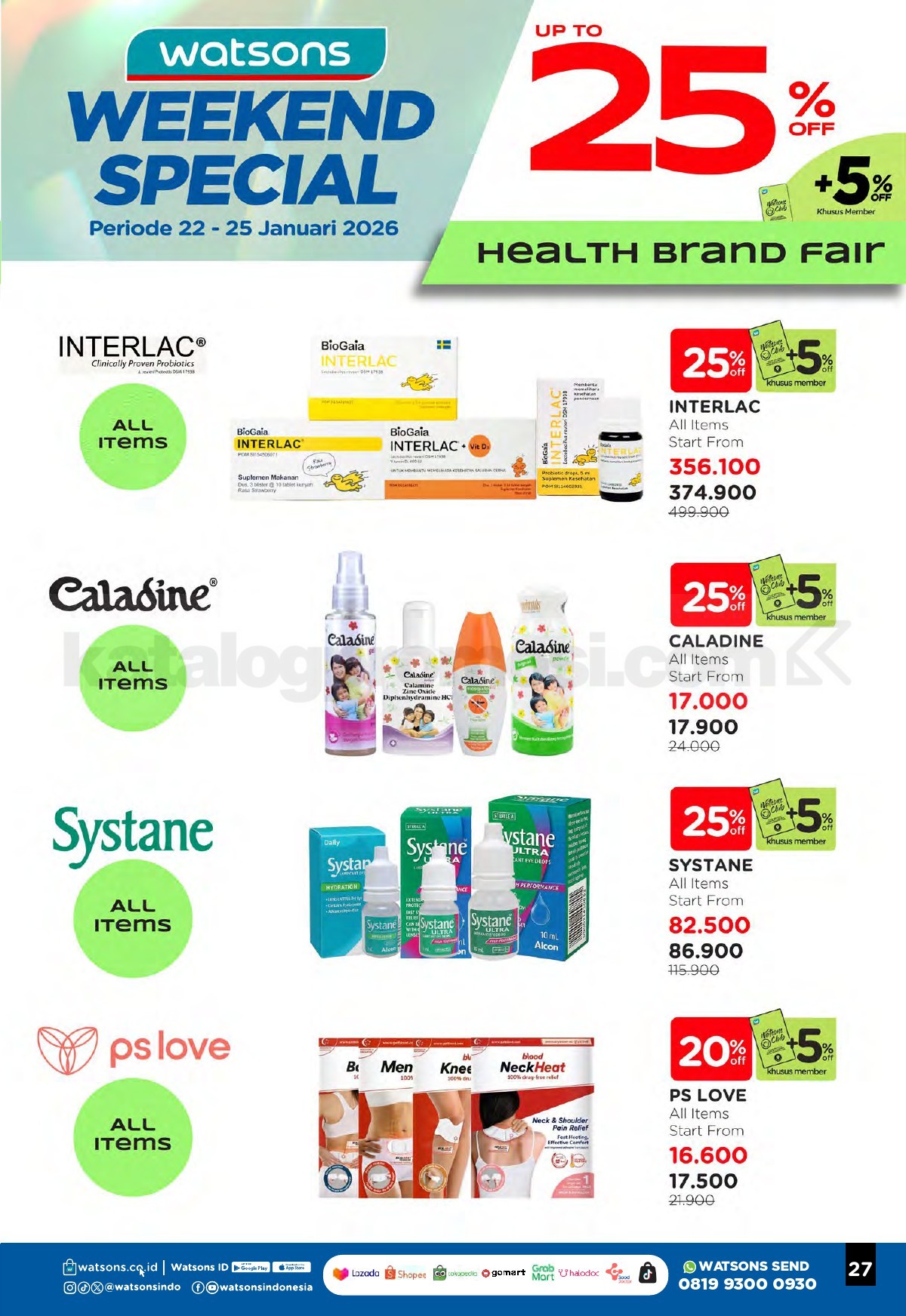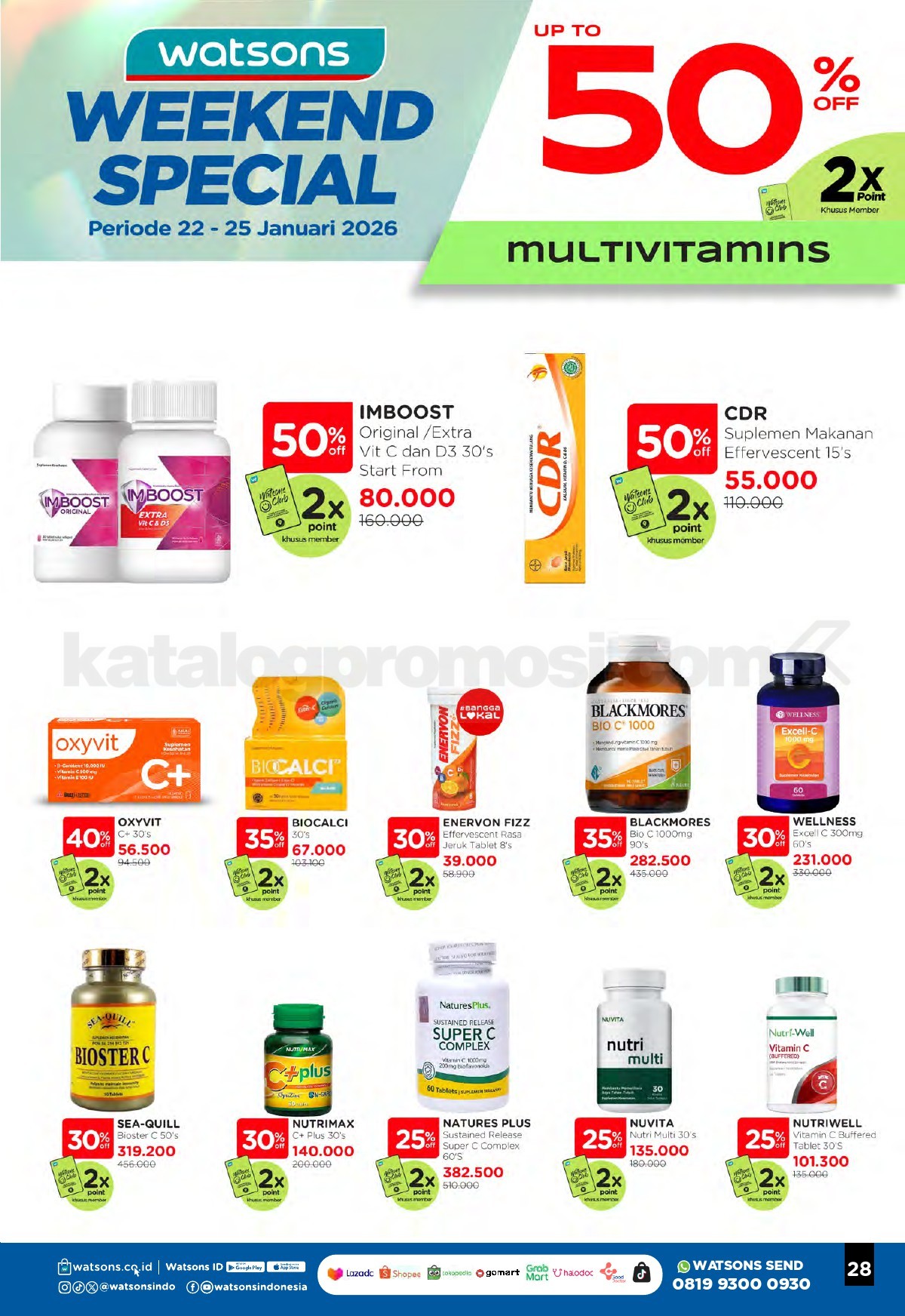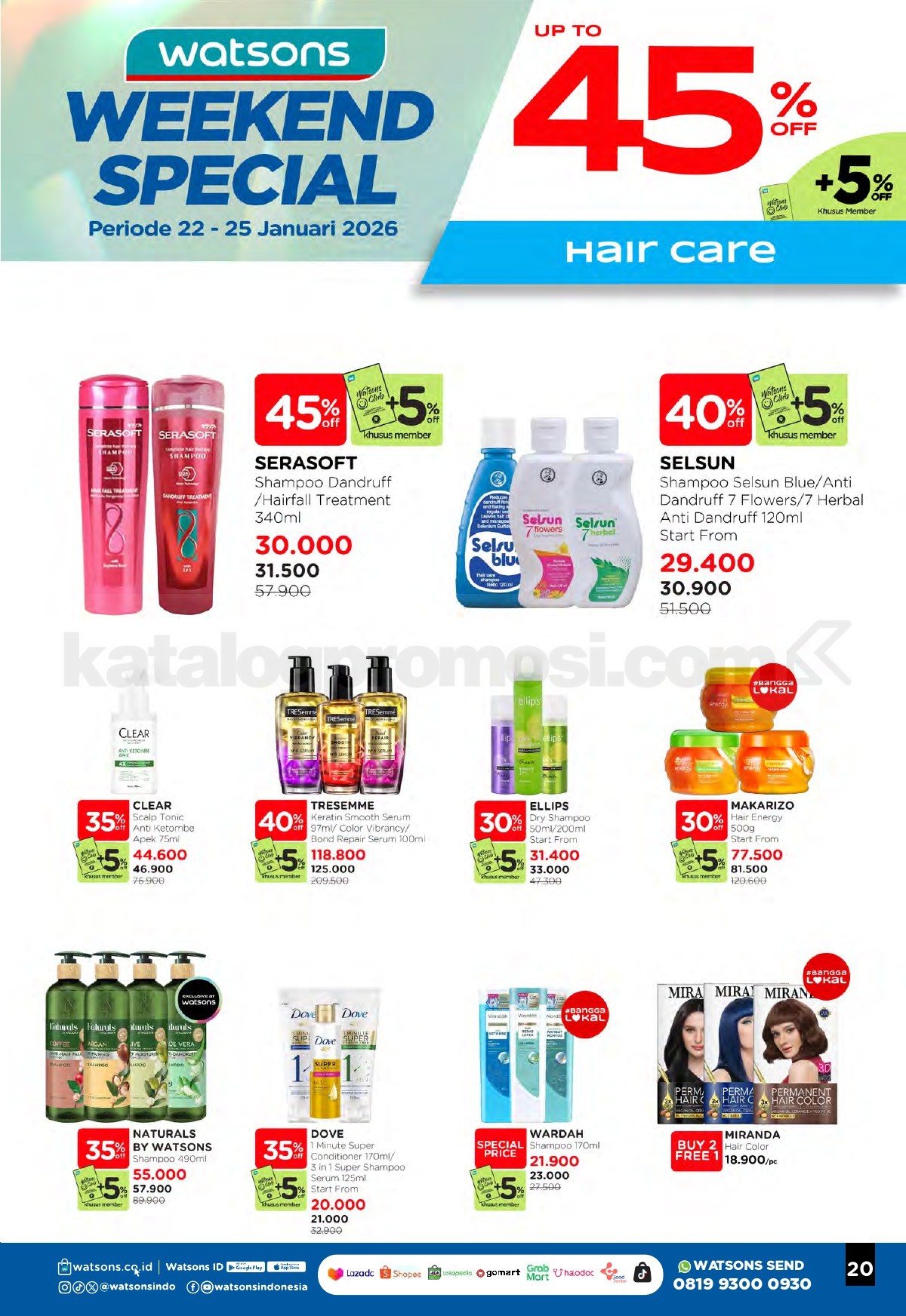 Promo Watsons Weekend Beauty Deals diskon 35% + voucher hingga Rp. 75.000 & ekstra diskon 5% member, berlaku mulai 22-25 Januari 2026 di seluruh outlet.