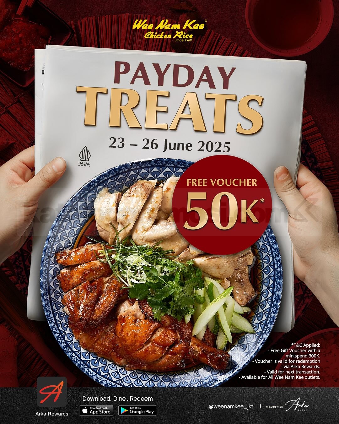 Akhir bulan jadi momen paling pas buat treat diri bareng promo spesial dari Wee Nam Kee! Selama periode 23 – 26 Juni 2025, kamu bisa dapetin Free Voucher Rp50.000 buat belanja selanjutnya setiap makan di outlet Wee Nam Kee minimal Rp300.000.