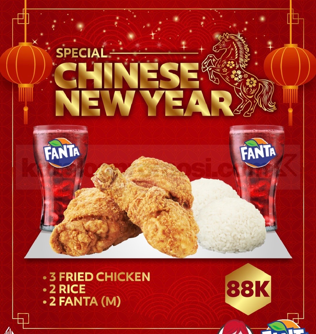 Dengan harga Rp. 88.000, kamu bisa mendapatkan 3 Chicken yang juicy, 2 Rice sebagai pelengkap, serta 2 Fanta ukuran M yang bikin suasana makan makin seru. Promo ini dirancang khusus untuk momen kebersamaan saat Tahun Baru Imlek, ketika makan bareng jadi tradisi yang selalu dinanti 🧨🍗🥤