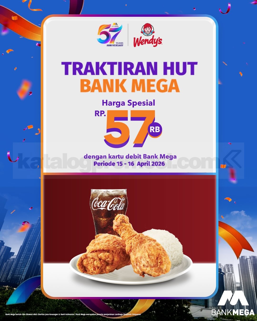 Promo Wendy’s HUT Bank Mega Diskon Hingga 57% dan combo 57rb bayar kartu Mega berlaku 15 April 2026 – 16 April 2026 di outlet tertentu