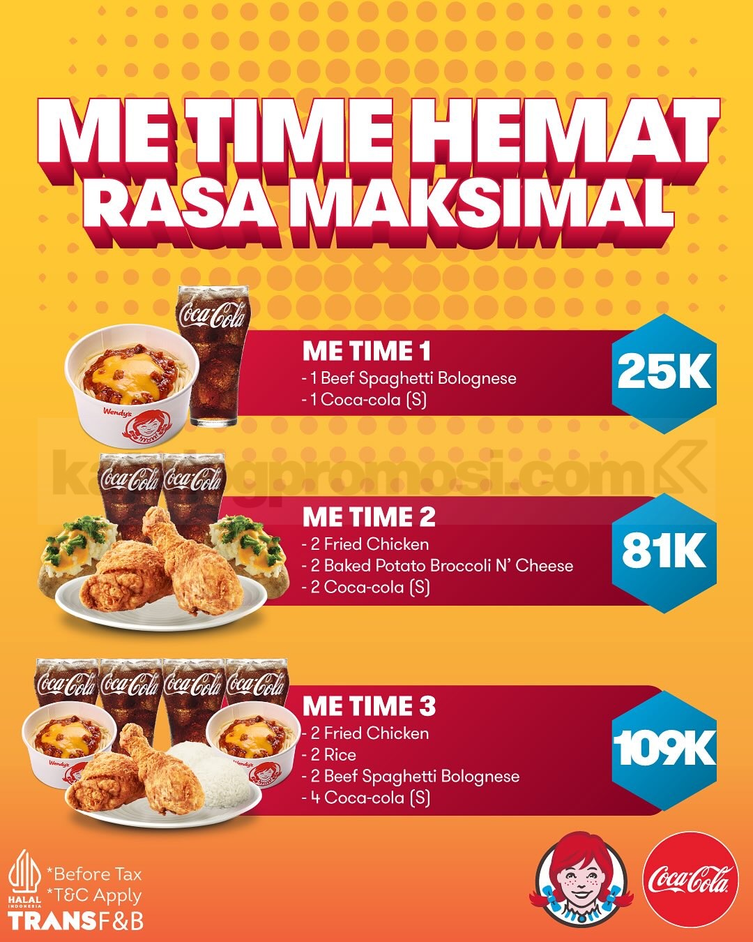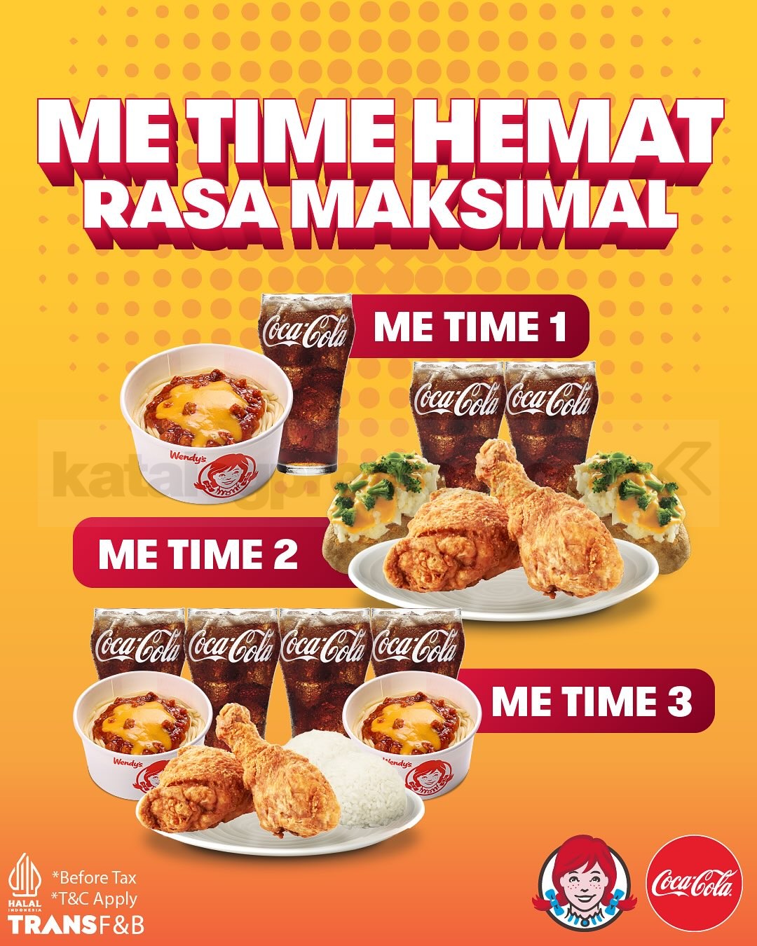 Promo Wendy’s Me Time Hemat Rasa Maksimal mulai Rp.25.000 dengan menu lezat dan Coca-Cola segar, berlaku waktu terbatas di outlet tertentu Wendy’s Indonesia.