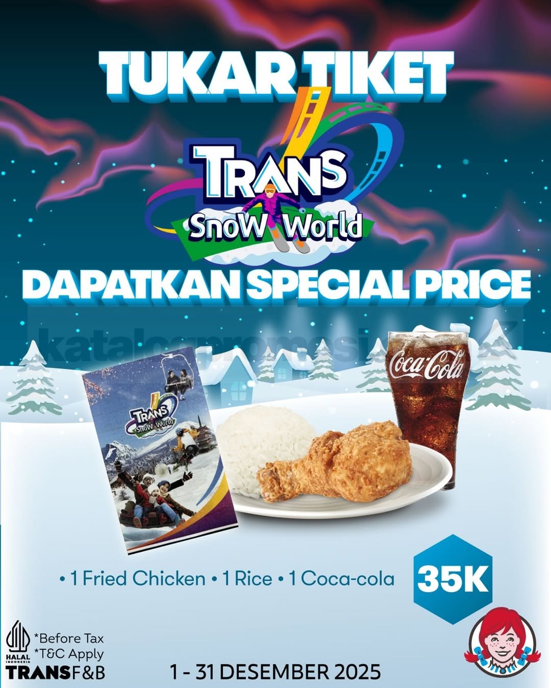 Promo Wendy’s Tukar Tiket Trans Snow World Paket Fried Chicken Rp. 35.000 untuk 1 ayam, nasi, dan Coca-Cola, berlaku 1–31 Desember 2025 di lokasi tertentu.