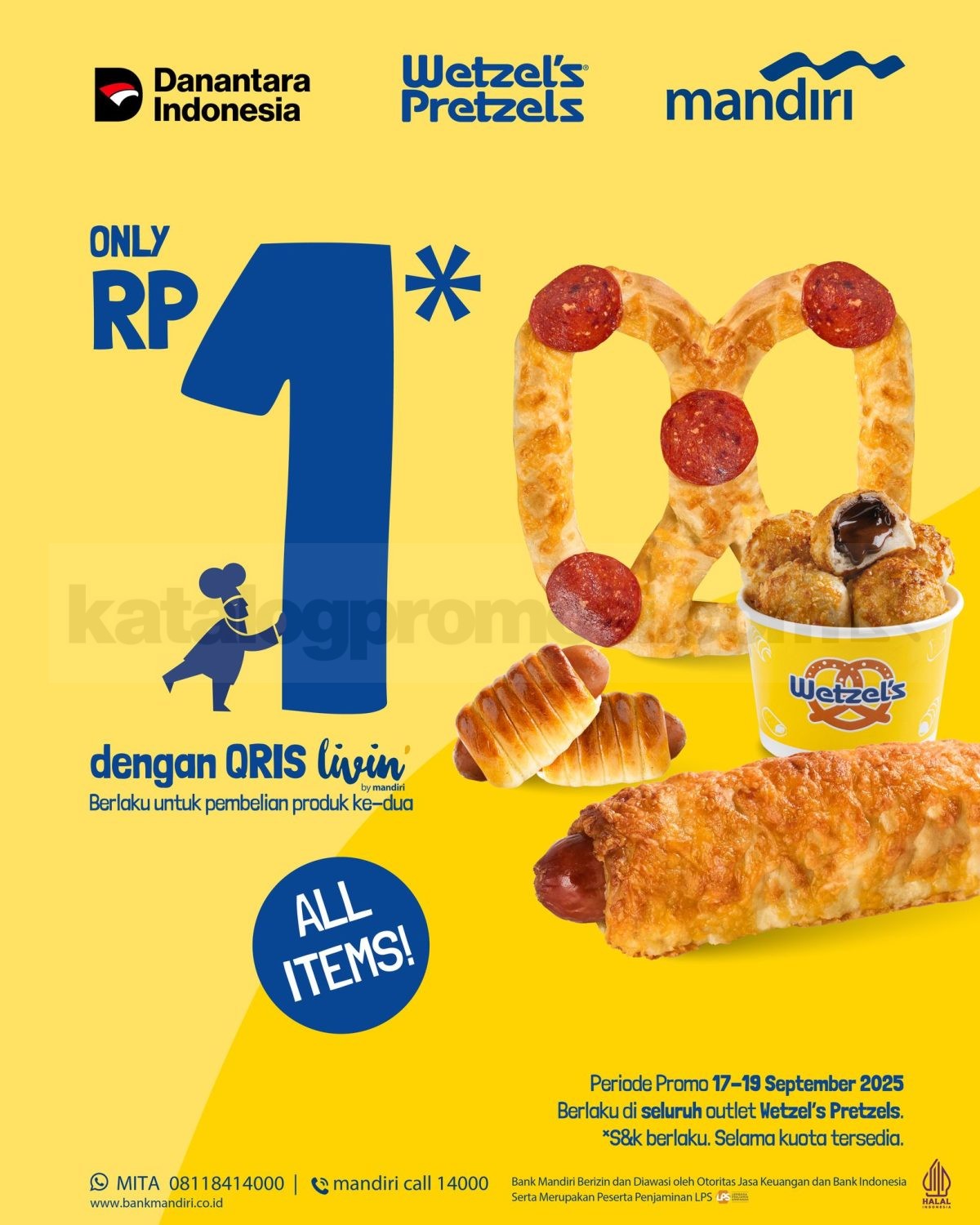 Promo Wetzel’s Pretzels Rp1 untuk pembelian produk kedua berlaku 17 – 19 September 2025 di outlet tertentu dengan pembayaran QRIS Livin’ by Mandiri.
